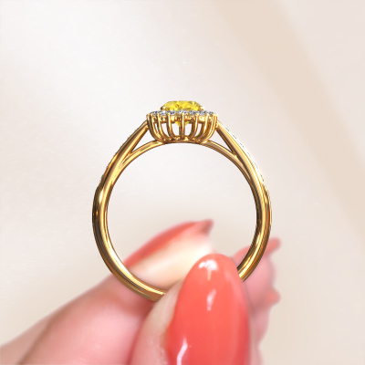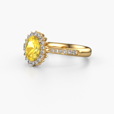Bovenstaande verlovingsring heeft de naam Tilly ovl 2. Dit type verlovingsring noemen we een entourage ring, hierbij worden rondom de middensteen in een open zetting allemaal kleine edelstenen gezet. Deze verlovingsring uitgevoerd in 14 Carat goud heeft een ovale gele saffier van 7x5 mm als center steen met daaromheen kleine lab-grown diamanten. Als je naar deze gouden entourage verlovingsring kijkt, krijg je het idee dat de kleinere edelstenen samen met de grote gele saffier tot één grote fonkelende edelsteen samensmelten, in de vorm van een prachtige bloem. Een andere naam voor deze klassieke verlovingsring is hierdoor ook wel de flower of de rozet ring. Deze kleinere lab-grown diamanten moeten dan echter wel allen op eenzelfde manier geplaatst zijn, zodat het licht in de gele saffier niet onderbroken wordt en er inderdaad een prachtige eenheid gecreëerd wordt. En daar zorgen onze meestergoudsmeden voor. Met uiterste precisie wordt iedere zorgvuldig geselecteerde gele saffier met de hand in de verlovingsring geplaatst. Steeds opnieuw wordt de verlovingsring onder de loep gehouden om te zien of het speciale effect nog steeds zichtbaar is. Door onze modernste technieken kunnen wij met uiterste precisie prachtige sieraden te ontwerpen en voor jou personaliseren in de hoogste juwelierskwaliteit. Tegelijkertijd zijn onze verlovingsringen altijd 30% goedkoper dan bij een andere juwelier. Dit komt doordat alle verlovingsringen pas vervaardigd worden op het moment dat deze besteld wordt en we daardoor geen dure voorraden hoeven te hanteren. Mocht je aan een bepaald budget gebonden zijn, kunnen we je graag adviseren welke combinatie je het beste kunt kiezen.Ons team ontwerpt dagelijks nieuwe ringen in diverse stijlen. Heb je zelf een entourage verlovingsring ergens gezien, die jij het liefst aan jouw geliefde zou willen geven? Je kunt altijd jouw ideeën en ontwerp met onze sieradenontwerpers bespreken, want wij zetten graag jouw ontwerp om tot een klassieke verlovingsring. Je kunt tijdens het ontwerpproces steeds meekijken, omdat het ontwerp in een zeer gedetailleerde 3D tekening wordt omgezet. Daarbij kun je een dummy bestellen van het uiteindelijke ontwerp. Een dummy is een kunststof ring, die precies dezelfde vormen heeft als jouw uiteindelijke ontwerp. Je kunt deze passen en zien of de ontworpen verlovingsring helemaal naar jouw wens is. Wij sturen je graag een vrijblijvende offerte, waarbij je ongetwijfeld versteld zult staan over de prijs en de kwaliteit van de ring en edelstenen.Om het voor jou makkelijker te maken kun je ieder besteld sieraad binnen 30 dagen na aflevering eenvoudig weer retour sturen.