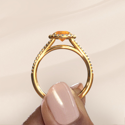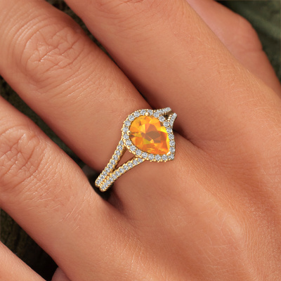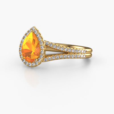 Bovenstaande verlovingsring heeft de naam Verla pear 2. Dit type verlovingsring noemen we een halo ring. De verlovingsring is uitgevoerd in 14 Carat goud en heeft als middensteen een peer citrien ter grootte van 8x6 mm en eromheen zijn kleine diamanten gezet. Het bijzondere van deze exclusieve gouden halo verlovingsring zijn de kleinere edelstenen die rondom de grote citrien zijn gezet. Dat is ook waar deze mooie verlovingsring zijn naam door heeft gekregen: halo betekent lichtkrans en dat is ook waar de kleinere edelstenen voor zorgen. Deze kleinere edelstenen moeten dan echter wel allen op dezelfde manier geplaatst zijn, zodat het licht niet doorbroken wordt in de citrien en er inderdaad een prachtige lichtkrans gecreëerd wordt. En daar zorgen onze meestergoudsmeden voor. Met uiterste precisie wordt iedere zorgvuldig geselecteerde citrien met de hand in de verlovingsring geplaatst. Steeds opnieuw wordt de verlovingsring tegen het licht gehouden om te zien of het speciale effect nog steeds zichtbaar is. Het resultaat is een unieke verlovingsring, waarbij de gekozen citrien letterlijk het stralende middelpunt wordt. Je kunt je voorstellen dat deze verlovingsring werkelijk een betekenisvolle verlovingsring is om aan jouw liefde voor het leven te schenken! Op de dag dat jij laat zien dat zij jouw stralende middelpunt is!Wist je dat we een beste prijs garantie geven voor jouw verlovingsring? Dit is mogelijk omdat al onze sieraden met de hand gemaakt worden in ons eigen atelier. We hebben geen dure voorraden, en we maken pas je verlovingsring op het moment dat je besteld hebt. Doordat we de hele productie zelf in de hand hebben, kunnen wij je goed informeren over alle eigenschappen van deze ring. Juist omdat het kopen van een verlovingsring online spannend is, begrijpen wij dat het fijn is om alle kenmerken te weten van jouw ring.Iedere dag is ons team van goudsmeden en sieradenontwerpers aan het werk om nieuwe sieraden te creëren. Het kan zijn dat je ergens een exclusieve verlovingsring gezien hebt, die je als basis wilt nemen bij het ontwerpen van jouw unieke ring. Neem gerust contact met ons op en we zullen je een aanbod doen, waar je vrijwel zeker verwonderd zult zijn over de kwaliteit en de prijs.Om het voor jou makkelijker te maken kun je ieder besteld sieraad binnen 30 dagen na aflevering eenvoudig weer retour sturen.