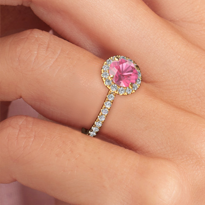 Bovenstaande verlovingsring heeft de naam Miranda rnd. Dit type verlovingsring noemen we een halo ring. De verlovingsring is uitgevoerd in 14 Carat goud en heeft als middensteen een ronde roze saffier ter grootte van 6.5 mm en eromheen zijn kleine lab-grown diamanten gezet. Het bijzondere van deze exclusieve gouden halo verlovingsring zijn de kleinere edelstenen die rondom de grote roze saffier zijn gezet. Dat is ook waar deze mooie verlovingsring zijn naam door heeft gekregen: halo betekent lichtkrans en dat is ook waar de kleinere edelstenen voor zorgen. Deze kleinere edelstenen moeten dan echter wel allen op dezelfde manier geplaatst zijn, zodat het licht niet doorbroken wordt in de roze saffier en er inderdaad een prachtige lichtkrans gecreëerd wordt. En daar zorgen onze meestergoudsmeden voor. Met uiterste precisie wordt iedere zorgvuldig geselecteerde roze saffier met de hand in de verlovingsring geplaatst. Steeds opnieuw wordt de verlovingsring tegen het licht gehouden om te zien of het speciale effect nog steeds zichtbaar is. Het resultaat is een unieke verlovingsring, waarbij de gekozen roze saffier letterlijk het stralende middelpunt wordt. Je kunt je voorstellen dat deze verlovingsring werkelijk een betekenisvolle verlovingsring is om aan jouw liefde voor het leven te schenken! Op de dag dat jij laat zien dat zij jouw stralende middelpunt is!Door onze modernste technieken kunnen wij met uiterste precisie prachtige sieraden te ontwerpen en voor jou personaliseren in de hoogste juwelierskwaliteit. Tegelijkertijd zijn onze verlovingsringen altijd 30% goedkoper dan bij een andere juwelier. Dit komt doordat alle verlovingsringen pas vervaardigd worden op het moment dat deze besteld wordt en we daardoor geen dure voorraden hoeven te hanteren. Mocht je aan een bepaald budget gebonden zijn, kunnen we je graag adviseren welke combinatie je het beste kunt kiezen.Heb je zelf een specifieke verlovingsring ergens gezien, die je graag aan jouw geliefde zou willen geven? Bespreek gerust jouw ideeën met onze sieradenontwerpers, want wij zetten graag jouw ontwerp om tot een exclusieve verlovingsring. Je kunt tijdens het ontwerpproces steeds meekijken, omdat wij met 3D tekeningen werken. Je krijgt hierdoor al een realistische indruk van hoe jouw ontwerp er in werkelijkheid uit komt te zien. Daarbij kun je een dummy vooraf bestellen. Een dummy is een kunststof ring, die precies dezelfde vormen heeft als jouw uiteindelijke ontwerp. Je kunt deze passen en zien of de breedte en dikte bijvoorbeeld naar wens zijn. Wij sturen je graag een vrijblijvende offerte, waarbij je ongetwijfeld versteld zult staan over de prijs en de kwaliteit van de ring en edelstenen.Om het voor jou makkelijker te maken kun je ieder besteld sieraad binnen 30 dagen na aflevering eenvoudig weer retour sturen.