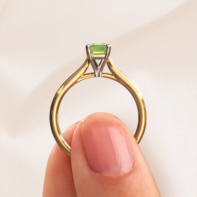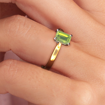 Deze verlovingsring heeft de naam Mignon eme 1. Deze ring, uitgevoerd in 14 Carat goud is gezet met peridoot. Ben je op zoek naar een unieke gouden verlovingsring met een eigentijdse uitstraling? Dan is dit een mooie ring, die je zelf naar jouw of haar smaak verder kunt aanpassen. In deze eigentijdse verlovingsring is prachtige peridoot verwerkt. Deze is zorgvuldig geselecteerd, want op jouw charmante verlovingsring mag alleen de mooiste edelsteen schitteren. Onze goudsmid vervaardigt jouw verlovingsring in ons eigen atelier, en plaatst de peridoot met uiterste precisie in de ring. Vervolgens wordt deze bijgewerkt en gepolijst totdat het resultaat zichtbaar is: de perfecte verlovingsring voor de liefde van jouw leven!Onze goudsmeden vervaardigen pas je Mignon eme 1 verlovingsring, zodra je deze besteld hebt. We hebben geen voorraden. Het voordeel hiervan is dat we de voorraad niet door hoeven te berekenen in de prijs, en kunnen daardoor sieraden leveren tegen een bijzonder lage prijs.Ons team is iedere dag weer bezig om nieuwe ontwerpen toe te voegen, in samenwerking met onze designers en goudsmeden wordt gekeken hoe we tot het mooiste ontwerp kunnen komen. Wij doen ons best om tot een zo gevarieerd mogelijk aanbod te komen. Wellicht heb je zelf al een mooi idee van een sieraad dat je ooit wel eens gezien hebt. Neem dan eens vrijblijvend contact met ons op. Wij maken een offerte voor je op waarbij wij vrij zeker zijn dat we wat betreft kwaliteit en prijs jou versteld zullen laten staan.Om het voor jou makkelijker te maken kun je ieder besteld sieraad binnen 30 dagen na aflevering eenvoudig weer retour sturen.
