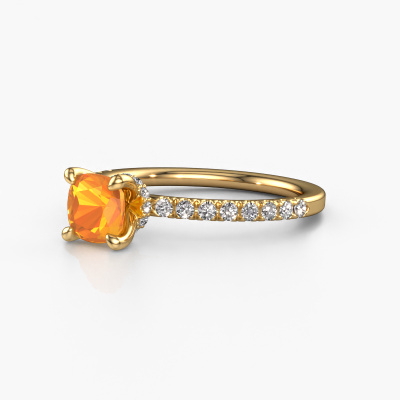 Bovenstaande verlovingsring heeft de naam Crystal CUS 4. Dit type verlovingsring noemen we een pavé solitaire verlovingsring omdat hij een enkele middensteen heeft waarbij de banden van de verlovingsring ook volgezet zijn. De verlovingsring is uitgevoerd in de combinatie 14 Carat goud met goud en heeft als middensteen een cushion citrien ter grootte van 5.5 mm en in de zijbanden zijn diamanten gezet. Ieder juweel is gemaakt om aan je vinger te stralen, ieder sieraad wordt met liefde door onze goudsmeden met de hand gemaakt.Deze chique gouden pavé solitaire verlovingsring heeft een schitterende cushion citrien als centersteen, waarbij in de band nog meer citrien zijn gezet om de middensteen nog meer te accentueren. Doordat de zetting van de pootjes om de citrien open is, vangt de citrien het licht van alle kanten op en schittert hierdoor optimaal. Hierboven kun je zien hoe onze goudsmid de verlovingsring heel precies tot in de kleinste details heeft bewerkt, zodat de wat hoger gelegen citrien een echte eyecatcher is. Wat een prachtige verlovingsring om te geven bij je aanzoek aan de liefde van jouw leven, aan jouw stralende middelpunt!Door onze modernste technieken kunnen wij met uiterste precisie prachtige sieraden te ontwerpen en voor jou personaliseren in de hoogste juwelierskwaliteit. Tegelijkertijd zijn onze verlovingsringen altijd 30% goedkoper dan bij een andere juwelier. Dit komt doordat alle verlovingsringen pas vervaardigd worden op het moment dat deze besteld wordt en we daardoor geen dure voorraden hoeven te hanteren. Mocht je aan een bepaald budget gebonden zijn, kunnen we je graag adviseren welke combinatie je het beste kunt kiezen.Heb je zelf een speciale ring in gedachten, die je wellicht ergens gezien hebt? Je kunt je ideeën altijd met ons bespreken, wij zetten graag jouw ontwerp om tot een unieke verlovingsring. Het ontwerp kun je volgen, omdat wij met 3D tekeningen werken. Hierdoor krijg je al een realistische indruk van hoe jouw ontwerp er in het echt uit komt te zien. Wij sturen je graag een vrijblijvende offerte, waarbij je ongetwijfeld verwonderd zult zijn over de prijs in combinatie met de uitstekende kwaliteit die we aanbieden.Om het voor jou makkelijker te maken kun je ieder besteld sieraad binnen 30 dagen na aflevering eenvoudig weer retour sturen.