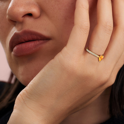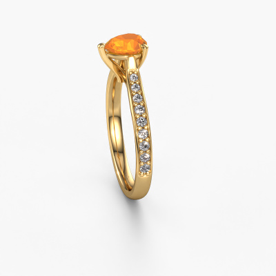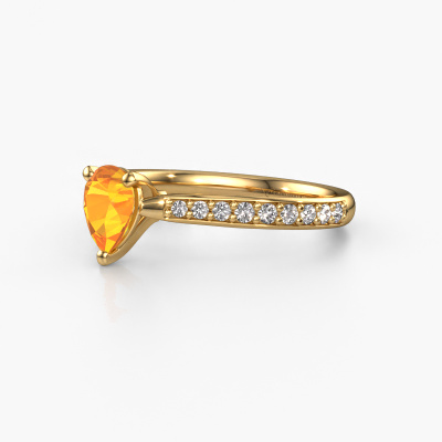 Bovenstaande verlovingsring heeft de naam Mignon per 2. Dit type verlovingsring noemen we een pavé solitaire verlovingsring omdat hij een enkele middensteen heeft waarbij de banden van de verlovingsring ook volgezet zijn. De verlovingsring is uitgevoerd in de combinatie 14 Carat goud met goud en heeft als middensteen een peer citrien ter grootte van 6.5x4.5 mm en in de zijbanden zijn diamanten gezet. Ieder juweel wordt speciaal voor jou gemaakt door onze meester goudsmeden in ons eigen atelier.Deze trendy gouden pavé solitaire verlovingsring heeft een schitterende peer citrien als centersteen, waarbij in de band nog meer citrien zijn gezet om de middensteen nog meer te accentueren. Doordat de zetting van de pootjes om de citrien open is, vangt de citrien het licht van alle kanten op en schittert hierdoor optimaal. Hierboven kun je zien hoe onze goudsmid de verlovingsring heel precies tot in de kleinste details heeft bewerkt, zodat de wat hoger gelegen citrien een echte eyecatcher is. Wat een prachtige verlovingsring om te geven bij je aanzoek aan de liefde van jouw leven, aan jouw stralende middelpunt!Wellicht is het je opgevallen dat onze prijzen gemiddeld 30% lager liggen dan bij een andere juwelier. En dat terwijl de kwaliteit in de meeste gevallen nog beter is! Dit komt doordat onze goudsmeden je verlovingsring direct in ons eigen atelier vervaardigen. Hierdoor hoeven we geen dure voorraden te hanteren en kunnen we ieder gewenst detail direct op jouw verlovingsring aanbrengen.Ons team is iedere dag weer bezig om nieuwe ontwerpen toe te voegen, in samenwerking met onze designers en goudsmeden wordt gekeken hoe we tot het mooiste ontwerp kunnen komen. Wij doen ons best om tot een zo gevarieerd mogelijk aanbod te komen. Wellicht heb je zelf al een mooi idee van een sieraad dat je ooit wel eens gezien hebt. Neem dan eens vrijblijvend contact met ons op. Wij maken een offerte voor je op waarbij wij vrij zeker zijn dat we wat betreft kwaliteit en prijs jou versteld zullen laten staan.Om het voor jou makkelijker te maken kun je ieder besteld sieraad binnen 30 dagen na aflevering eenvoudig weer retour sturen.