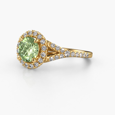 Bovenstaande verlovingsring heeft de naam Kimber RND. Dit type verlovingsring noemen we een pavé solitaire verlovingsring omdat hij een enkele middensteen heeft waarbij de banden van de verlovingsring ook volgezet zijn. De verlovingsring is uitgevoerd in de combinatie 14 Carat goud met goud en heeft als middensteen een ronde groene lab grown diamant ter grootte van 7 mm en in de zijbanden zijn lab-grown diamanten gezet. Ieder juweel is gemaakt om aan je vinger te stralen, ieder sieraad wordt met liefde door onze goudsmeden met de hand gemaakt.Deze klassieke gouden pavé solitaire verlovingsring heeft een schitterende ronde groene lab grown diamant als centersteen, waarbij in de band nog meer groene lab grown diamanten zijn gezet om de middensteen nog meer te accentueren. Doordat de zetting van de pootjes om de groene lab grown diamant open is, vangt de groene lab grown diamant het licht van alle kanten op en schittert hierdoor optimaal. Hierboven kun je zien hoe onze goudsmid de verlovingsring heel precies tot in de kleinste details heeft bewerkt, zodat de wat hoger gelegen groene lab grown diamant een echte eyecatcher is. Wat een prachtige verlovingsring om te geven bij je aanzoek aan de liefde van jouw leven, aan jouw stralende middelpunt!Wist je dat we een beste prijs garantie geven voor jouw verlovingsring? Dit is mogelijk omdat al onze sieraden met de hand gemaakt worden in ons eigen atelier. We hebben geen dure voorraden, en we maken pas je verlovingsring op het moment dat je besteld hebt. Doordat we de hele productie zelf in de hand hebben, kunnen wij je goed informeren over alle eigenschappen van deze ring. Juist omdat het kopen van een verlovingsring online spannend is, begrijpen wij dat het fijn is om alle kenmerken te weten van jouw ring.Ons team is iedere dag weer bezig om nieuwe ontwerpen toe te voegen, in samenwerking met onze designers en goudsmeden wordt gekeken hoe we tot het mooiste ontwerp kunnen komen. Wij doen ons best om tot een zo gevarieerd mogelijk aanbod te komen. Wellicht heb je zelf al een mooi idee van een sieraad dat je ooit wel eens gezien hebt. Neem dan eens vrijblijvend contact met ons op. Wij maken een offerte voor je op waarbij wij vrij zeker zijn dat we wat betreft kwaliteit en prijs jou versteld zullen laten staan.Om het voor jou makkelijker te maken kun je ieder besteld sieraad binnen 30 dagen na aflevering eenvoudig weer retour sturen.