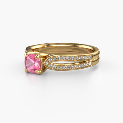 Bovenstaande verlovingsring heeft de naam Antonia cus 2. Dit type verlovingsring noemen we een pavé solitaire verlovingsring omdat hij een enkele middensteen heeft waarbij de banden van de verlovingsring ook volgezet zijn. De verlovingsring is uitgevoerd in de combinatie 14 Carat goud met goud en heeft als middensteen een cushion roze saffier ter grootte van 5 mm en in de zijbanden zijn lab-grown diamanten gezet. Ieder juweel wordt speciaal voor jou gemaakt door onze meester goudsmeden in ons eigen atelier.Deze fantasie gouden pavé solitaire verlovingsring heeft een schitterende cushion roze saffier als centersteen, waarbij in de band nog meer roze saffier zijn gezet om de middensteen nog meer te accentueren. Doordat de zetting van de pootjes om de roze saffier open is, vangt de roze saffier het licht van alle kanten op en schittert hierdoor optimaal. Hierboven kun je zien hoe onze goudsmid de verlovingsring heel precies tot in de kleinste details heeft bewerkt, zodat de wat hoger gelegen roze saffier een echte eyecatcher is. Wat een prachtige verlovingsring om te geven bij je aanzoek aan de liefde van jouw leven, aan jouw stralende middelpunt!Door onze modernste technieken kunnen wij met uiterste precisie prachtige sieraden te ontwerpen en voor jou personaliseren in de hoogste juwelierskwaliteit. Tegelijkertijd zijn onze verlovingsringen altijd 30% goedkoper dan bij een andere juwelier. Dit komt doordat alle verlovingsringen pas vervaardigd worden op het moment dat deze besteld wordt en we daardoor geen dure voorraden hoeven te hanteren. Mocht je aan een bepaald budget gebonden zijn, kunnen we je graag adviseren welke combinatie je het beste kunt kiezen.Heb je zelf een specifieke verlovingsring ergens gezien, die je graag aan jouw geliefde zou willen geven? Bespreek gerust jouw ideeën met onze sieradenontwerpers, want wij zetten graag jouw ontwerp om tot een fantasie verlovingsring. Je kunt tijdens het ontwerpproces steeds meekijken, omdat wij met 3D tekeningen werken. Je krijgt hierdoor al een realistische indruk van hoe jouw ontwerp er in werkelijkheid uit komt te zien. Daarbij kun je een dummy vooraf bestellen. Een dummy is een kunststof ring, die precies dezelfde vormen heeft als jouw uiteindelijke ontwerp. Je kunt deze passen en zien of de breedte en dikte bijvoorbeeld naar wens zijn. Wij sturen je graag een vrijblijvende offerte, waarbij je ongetwijfeld versteld zult staan over de prijs en de kwaliteit van de ring en edelstenen.Om het voor jou makkelijker te maken kun je ieder besteld sieraad binnen 30 dagen na aflevering eenvoudig weer retour sturen.