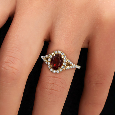 Bovenstaande verlovingsring heeft de naam Kimber OVL. Dit type verlovingsring noemen we een pavé solitaire verlovingsring omdat hij een enkele middensteen heeft waarbij de banden van de verlovingsring ook volgezet zijn. De verlovingsring is uitgevoerd in de combinatie 14 Carat goud met goud en heeft als middensteen een ovale granaat ter grootte van 8x6 mm en in de zijbanden zijn lab-grown diamanten gezet. Ieder juweel wordt met passie en liefde gemaakt door één van onze meestergoudsmeden.Deze exclusieve gouden pavé solitaire verlovingsring heeft een schitterende ovale granaat als centersteen, waarbij in de band nog meer granaat zijn gezet om de middensteen nog meer te accentueren. Doordat de zetting van de pootjes om de granaat open is, vangt de granaat het licht van alle kanten op en schittert hierdoor optimaal. Hierboven kun je zien hoe onze goudsmid de verlovingsring heel precies tot in de kleinste details heeft bewerkt, zodat de wat hoger gelegen granaat een echte eyecatcher is. Wat een prachtige verlovingsring om te geven bij je aanzoek aan de liefde van jouw leven, aan jouw stralende middelpunt!Door het gebruik van de modernste technieken, gecombineerd met ambachtelijk vakmanschap kunnen wij alle verlovingsringen zelf in ons atelier maken. Ieder sieraad wordt pas gemaakt nadat deze besteld is. Dit heeft als bijkomend voordeel dat we kunnen leveren tegen een prijs die je nergens anders tegenkomt.Ons team is iedere dag weer bezig om nieuwe ontwerpen toe te voegen, in samenwerking met onze designers en goudsmeden wordt gekeken hoe we tot het mooiste ontwerp kunnen komen. Wij doen ons best om tot een zo gevarieerd mogelijk aanbod te komen. Wellicht heb je zelf al een mooi idee van een sieraad dat je ooit wel eens gezien hebt. Neem dan eens vrijblijvend contact met ons op. Wij maken een offerte voor je op waarbij wij vrij zeker zijn dat we wat betreft kwaliteit en prijs jou versteld zullen laten staan.Om het voor jou makkelijker te maken kun je ieder besteld sieraad binnen 30 dagen na aflevering eenvoudig weer retour sturen.
