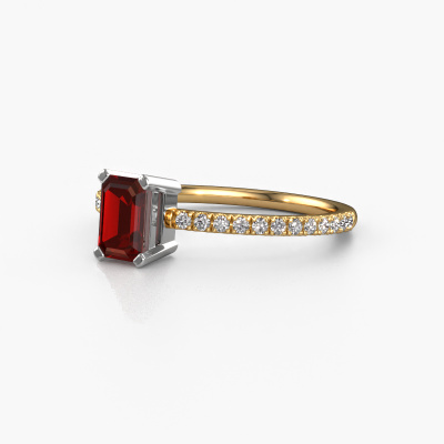 Bovenstaande verlovingsring heeft de naam Denita 2 EME. Dit type verlovingsring noemen we een pavé solitaire verlovingsring omdat hij een enkele middensteen heeft waarbij de banden van de verlovingsring ook volgezet zijn. Deze verlovingsring is uitgevoerd in 14 Carat goud en heeft als middensteen een smaragd geslepen granaat ter grootte van 6x4 mm, en in de zijbanden zijn diamanten gezet. Ieder juweel wordt speciaal voor jou gemaakt door onze meester goudsmeden in ons eigen atelier.. Deze traditionele gouden pavé solitaire verlovingsring heeft een schitterende smaragd geslepen granaat als center steen, waarbij in de band nog meer diamanten zijn gezet om de middensteen nog meer te accentueren. Doordat de zetting van de pootjes om de granaat open is, vangt de granaat het licht van alle kanten op en schittert hierdoor optimaal. Hierboven kun je zien hoe onze goudsmid de verlovingsring heel precies tot in de kleinste details heeft bewerkt, zodat de wat hoger gelegen granaat een echte eyecatcher is. Wat een prachtige verlovingsring om te geven bij je aanzoek aan de liefde van jouw leven, aan jouw stralende middelpunt!Wellicht is het je opgevallen dat onze prijzen gemiddeld 30% lager liggen dan bij een andere juwelier. En dat terwijl de kwaliteit in de meeste gevallen nog beter is! Dit komt doordat onze goudsmeden je verlovingsring direct in ons eigen atelier vervaardigen. Hierdoor hoeven we geen dure voorraden te hanteren en kunnen we ieder gewenst detail direct op jouw verlovingsring aanbrengen.Ons team is iedere dag weer bezig om nieuwe ontwerpen toe te voegen, in samenwerking met onze designers en goudsmeden wordt gekeken hoe we tot het mooiste ontwerp kunnen komen. Wij doen ons best om tot een zo gevarieerd mogelijk aanbod te komen. Wellicht heb je zelf al een mooi idee van een sieraad dat je ooit wel eens gezien hebt. Neem dan eens vrijblijvend contact met ons op. Wij maken een offerte voor je op waarbij wij vrij zeker zijn dat we wat betreft kwaliteit en prijs jou versteld zullen laten staan.Om het voor jou makkelijker te maken kun je ieder besteld sieraad binnen 30 dagen na aflevering eenvoudig weer retour sturen.