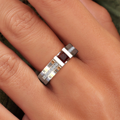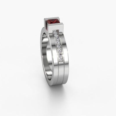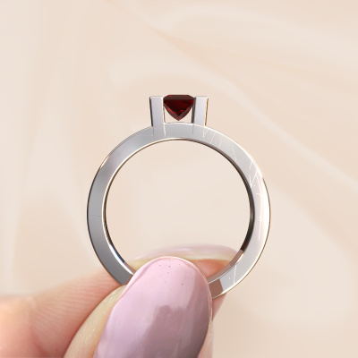 Bovenstaande verlovingsring heeft de naam Desire. Dit type verlovingsring noemen we een pavé solitaire verlovingsring omdat hij een enkele middensteen heeft waarbij de banden van de verlovingsring ook volgezet zijn. De verlovingsring is uitgevoerd in de combinatie 14 Carat witgoud met witgoud en heeft als middensteen een princess granaat ter grootte van 4 mm en in de zijbanden zijn diamanten gezet. Ieder juweel wordt speciaal voor jou gemaakt door onze meester goudsmeden in ons eigen atelier.Deze moderne witgouden pavé solitaire verlovingsring heeft een schitterende princess granaat als centersteen, waarbij in de band nog meer granaat zijn gezet om de middensteen nog meer te accentueren. Doordat de zetting van de pootjes om de granaat open is, vangt de granaat het licht van alle kanten op en schittert hierdoor optimaal. Hierboven kun je zien hoe onze goudsmid de verlovingsring heel precies tot in de kleinste details heeft bewerkt, zodat de wat hoger gelegen granaat een echte eyecatcher is. Wat een prachtige verlovingsring om te geven bij je aanzoek aan de liefde van jouw leven, aan jouw stralende middelpunt!Door het gebruik van de modernste technieken, gecombineerd met ambachtelijk vakmanschap kunnen wij alle verlovingsringen zelf in ons atelier maken. Ieder sieraad wordt pas gemaakt nadat deze besteld is. Dit heeft als bijkomend voordeel dat we kunnen leveren tegen een prijs die je nergens anders tegenkomt.Heb je zelf een specifieke verlovingsring ergens gezien, die je graag aan jouw geliefde zou willen geven? Bespreek gerust jouw ideeën met onze sieradenontwerpers, want wij zetten graag jouw ontwerp om tot een moderne verlovingsring. Je kunt tijdens het ontwerpproces steeds meekijken, omdat wij met 3D tekeningen werken. Je krijgt hierdoor al een realistische indruk van hoe jouw ontwerp er in werkelijkheid uit komt te zien. Daarbij kun je een dummy vooraf bestellen. Een dummy is een kunststof ring, die precies dezelfde vormen heeft als jouw uiteindelijke ontwerp. Je kunt deze passen en zien of de breedte en dikte bijvoorbeeld naar wens zijn. Wij sturen je graag een vrijblijvende offerte, waarbij je ongetwijfeld versteld zult staan over de prijs en de kwaliteit van de ring en edelstenen.Om het voor jou makkelijker te maken kun je ieder besteld sieraad binnen 30 dagen na aflevering eenvoudig weer retour sturen.