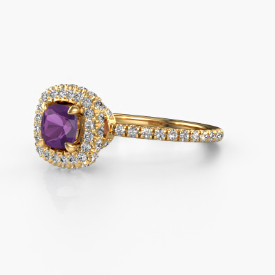 Bovenstaande verlovingsring heeft de naam Talitha CUS. Dit type verlovingsring noemen we een halo ring. De verlovingsring is uitgevoerd in 14 Carat goud en heeft als middensteen een cushion amethist ter grootte van 5 mm en eromheen zijn kleine diamanten gezet. Het bijzondere van deze traditionele gouden halo verlovingsring zijn de kleinere edelstenen die rondom de grote amethist zijn gezet. Dat is ook waar deze mooie verlovingsring zijn naam door heeft gekregen: halo betekent lichtkrans en dat is ook waar de kleinere edelstenen voor zorgen. Deze kleinere edelstenen moeten dan echter wel allen op dezelfde manier geplaatst zijn, zodat het licht niet doorbroken wordt in de amethist en er inderdaad een prachtige lichtkrans gecreëerd wordt. En daar zorgen onze meestergoudsmeden voor. Met uiterste precisie wordt iedere zorgvuldig geselecteerde amethist met de hand in de verlovingsring geplaatst. Steeds opnieuw wordt de verlovingsring tegen het licht gehouden om te zien of het speciale effect nog steeds zichtbaar is. Het resultaat is een unieke verlovingsring, waarbij de gekozen amethist letterlijk het stralende middelpunt wordt. Je kunt je voorstellen dat deze verlovingsring werkelijk een betekenisvolle verlovingsring is om aan jouw liefde voor het leven te schenken! Op de dag dat jij laat zien dat zij jouw stralende middelpunt is!Omdat wij zelf alle verlovingsring maken en direct aan jou leveren kunnen wij je een verlovingsring leveren tegen een prijs die je nergens anders zult tegenkomen. Een ring wordt pas gemaakt als we een bestelling krijgen, hierdoor hebben wij geen dure voorraden en kunnen wij je de beste prijs garanderen. Wij begrijpen dat het kopen van een verlovingsring online spannend is en willen daarom je zoveel mogelijk informeren over alle specifieke eigenschappen van de ring die jij koopt.Iedere dag is ons team van goudsmeden en sieradenontwerpers aan het werk om nieuwe sieraden te creëren. Het kan zijn dat je ergens een traditionele verlovingsring gezien hebt, die je als basis wilt nemen bij het ontwerpen van jouw unieke ring. Neem gerust contact met ons op en we zullen je een aanbod doen, waar je vrijwel zeker verwonderd zult zijn over de kwaliteit en de prijs.Om het voor jou makkelijker te maken kun je ieder besteld sieraad binnen 30 dagen na aflevering eenvoudig weer retour sturen.