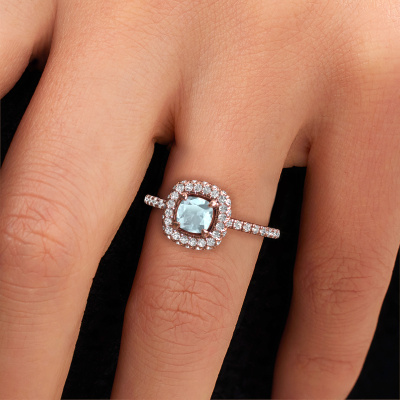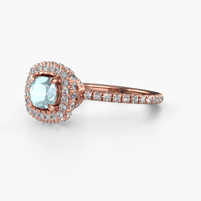 Bovenstaande verlovingsring heeft de naam Talitha CUS. Dit type verlovingsring noemen we een halo ring. De verlovingsring is uitgevoerd in 14 Carat rosé goud en heeft als middensteen een cushion aquamarijn ter grootte van 5 mm en eromheen zijn kleine diamanten gezet. Het bijzondere van deze traditionele rosé gouden halo verlovingsring zijn de kleinere edelstenen die rondom de grote aquamarijn zijn gezet. Dat is ook waar deze mooie verlovingsring zijn naam door heeft gekregen: halo betekent lichtkrans en dat is ook waar de kleinere edelstenen voor zorgen. Deze kleinere edelstenen moeten dan echter wel allen op dezelfde manier geplaatst zijn, zodat het licht niet doorbroken wordt in de aquamarijn en er inderdaad een prachtige lichtkrans gecreëerd wordt. En daar zorgen onze meestergoudsmeden voor. Met uiterste precisie wordt iedere zorgvuldig geselecteerde aquamarijn met de hand in de verlovingsring geplaatst. Steeds opnieuw wordt de verlovingsring tegen het licht gehouden om te zien of het speciale effect nog steeds zichtbaar is. Het resultaat is een unieke verlovingsring, waarbij de gekozen aquamarijn letterlijk het stralende middelpunt wordt. Je kunt je voorstellen dat deze verlovingsring werkelijk een betekenisvolle verlovingsring is om aan jouw liefde voor het leven te schenken! Op de dag dat jij laat zien dat zij jouw stralende middelpunt is!Omdat wij zelf alle verlovingsring maken en direct aan jou leveren kunnen wij je een verlovingsring leveren tegen een prijs die je nergens anders zult tegenkomen. Een ring wordt pas gemaakt als we een bestelling krijgen, hierdoor hebben wij geen dure voorraden en kunnen wij je de beste prijs garanderen. Wij begrijpen dat het kopen van een verlovingsring online spannend is en willen daarom je zoveel mogelijk informeren over alle specifieke eigenschappen van de ring die jij koopt.Iedere dag is ons team van goudsmeden en sieradenontwerpers aan het werk om nieuwe sieraden te creëren. Het kan zijn dat je ergens een traditionele verlovingsring gezien hebt, die je als basis wilt nemen bij het ontwerpen van jouw unieke ring. Neem gerust contact met ons op en we zullen je een aanbod doen, waar je vrijwel zeker verwonderd zult zijn over de kwaliteit en de prijs.Om het voor jou makkelijker te maken kun je ieder besteld sieraad binnen 30 dagen na aflevering eenvoudig weer retour sturen.