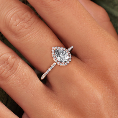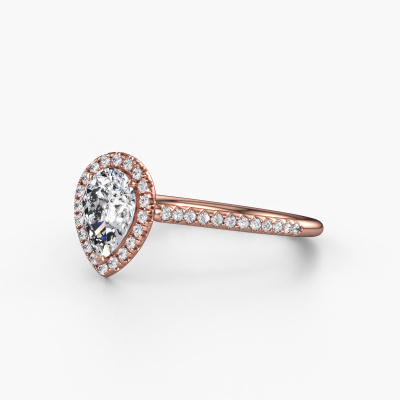 Bovenstaande verlovingsring heeft de naam Seline per 2. Dit type verlovingsring noemen we een halo ring. De verlovingsring is uitgevoerd in 14 Carat rosé goud en heeft als middensteen een peer diamant ter grootte van 0.65 crt en eromheen zijn kleine diamanten gezet. Het bijzondere van deze klassieke rosé gouden halo verlovingsring zijn de kleinere edelstenen die rondom de grote diamant zijn gezet. Dat is ook waar deze mooie verlovingsring zijn naam door heeft gekregen: halo betekent lichtkrans en dat is ook waar de kleinere edelstenen voor zorgen. Deze kleinere edelstenen moeten dan echter wel allen op dezelfde manier geplaatst zijn, zodat het licht niet doorbroken wordt in de diamant en er inderdaad een prachtige lichtkrans gecreëerd wordt. En daar zorgen onze meestergoudsmeden voor. Met uiterste precisie wordt iedere zorgvuldig geselecteerde diamant met de hand in de verlovingsring geplaatst. Steeds opnieuw wordt de verlovingsring tegen het licht gehouden om te zien of het speciale effect nog steeds zichtbaar is. Het resultaat is een unieke verlovingsring, waarbij de gekozen diamant letterlijk het stralende middelpunt wordt. Je kunt je voorstellen dat deze verlovingsring werkelijk een betekenisvolle verlovingsring is om aan jouw liefde voor het leven te schenken! Op de dag dat jij laat zien dat zij jouw stralende middelpunt is!Omdat wij zelf alle verlovingsring maken en direct aan jou leveren kunnen wij je een verlovingsring leveren tegen een prijs die je nergens anders zult tegenkomen. Een ring wordt pas gemaakt als we een bestelling krijgen, hierdoor hebben wij geen dure voorraden en kunnen wij je de beste prijs garanderen. Wij begrijpen dat het kopen van een verlovingsring online spannend is en willen daarom je zoveel mogelijk informeren over alle specifieke eigenschappen van de ring die jij koopt.Iedere dag is ons team van goudsmeden en sieradenontwerpers aan het werk om nieuwe sieraden te creëren. Het kan zijn dat je ergens een klassieke verlovingsring gezien hebt, die je als basis wilt nemen bij het ontwerpen van jouw unieke ring. Neem gerust contact met ons op en we zullen je een aanbod doen, waar je vrijwel zeker verwonderd zult zijn over de kwaliteit en de prijs.Om het voor jou makkelijker te maken kun je ieder besteld sieraad binnen 30 dagen na aflevering eenvoudig weer retour sturen.