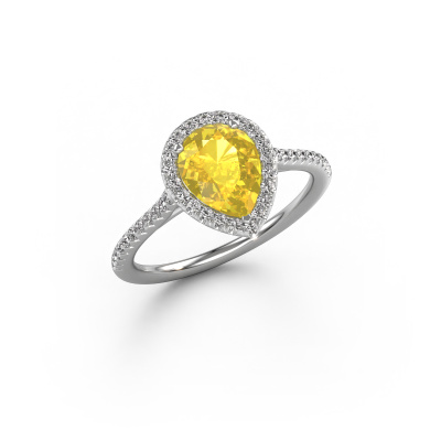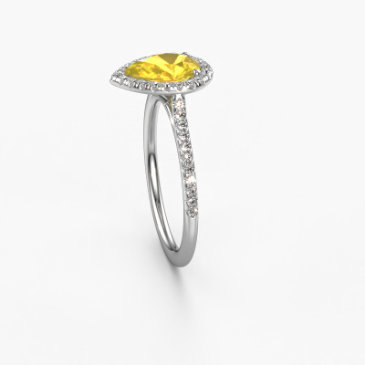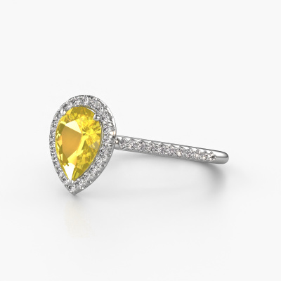 Bovenstaande verlovingsring heeft de naam Seline per 2. Dit type verlovingsring noemen we een halo ring. De verlovingsring is uitgevoerd in platina en heeft als middensteen een peer gele saffier ter grootte van 8x6 mm en eromheen zijn kleine diamanten gezet. Het bijzondere van deze klassieke platina halo verlovingsring zijn de kleinere edelstenen die rondom de grote gele saffier zijn gezet. Dat is ook waar deze mooie verlovingsring zijn naam door heeft gekregen: halo betekent lichtkrans en dat is ook waar de kleinere edelstenen voor zorgen. Deze kleinere edelstenen moeten dan echter wel allen op dezelfde manier geplaatst zijn, zodat het licht niet doorbroken wordt in de gele saffier en er inderdaad een prachtige lichtkrans gecreëerd wordt. En daar zorgen onze meestergoudsmeden voor. Met uiterste precisie wordt iedere zorgvuldig geselecteerde gele saffier met de hand in de verlovingsring geplaatst. Steeds opnieuw wordt de verlovingsring tegen het licht gehouden om te zien of het speciale effect nog steeds zichtbaar is. Het resultaat is een unieke verlovingsring, waarbij de gekozen gele saffier letterlijk het stralende middelpunt wordt. Je kunt je voorstellen dat deze verlovingsring werkelijk een betekenisvolle verlovingsring is om aan jouw liefde voor het leven te schenken! Op de dag dat jij laat zien dat zij jouw stralende middelpunt is!Omdat wij zelf alle verlovingsring maken en direct aan jou leveren kunnen wij je een verlovingsring leveren tegen een prijs die je nergens anders zult tegenkomen. Een ring wordt pas gemaakt als we een bestelling krijgen, hierdoor hebben wij geen dure voorraden en kunnen wij je de beste prijs garanderen. Wij begrijpen dat het kopen van een verlovingsring online spannend is en willen daarom je zoveel mogelijk informeren over alle specifieke eigenschappen van de ring die jij koopt.Iedere dag is ons team van goudsmeden en sieradenontwerpers aan het werk om nieuwe sieraden te creëren. Het kan zijn dat je ergens een klassieke verlovingsring gezien hebt, die je als basis wilt nemen bij het ontwerpen van jouw unieke ring. Neem gerust contact met ons op en we zullen je een aanbod doen, waar je vrijwel zeker verwonderd zult zijn over de kwaliteit en de prijs.Om het voor jou makkelijker te maken kun je ieder besteld sieraad binnen 30 dagen na aflevering eenvoudig weer retour sturen.