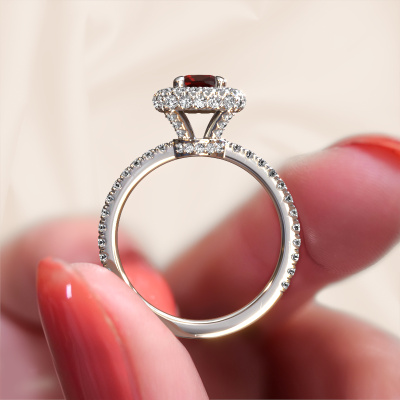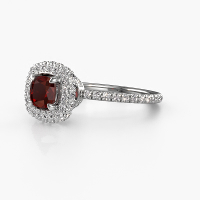 Bovenstaande verlovingsring heeft de naam Talitha CUS. Dit type verlovingsring noemen we een halo ring. De verlovingsring is uitgevoerd in platina en heeft als middensteen een cushion granaat ter grootte van 5 mm en eromheen zijn kleine diamanten gezet. Het bijzondere van deze traditionele platina halo verlovingsring zijn de kleinere edelstenen die rondom de grote granaat zijn gezet. Dat is ook waar deze mooie verlovingsring zijn naam door heeft gekregen: halo betekent lichtkrans en dat is ook waar de kleinere edelstenen voor zorgen. Deze kleinere edelstenen moeten dan echter wel allen op dezelfde manier geplaatst zijn, zodat het licht niet doorbroken wordt in de granaat en er inderdaad een prachtige lichtkrans gecreëerd wordt. En daar zorgen onze meestergoudsmeden voor. Met uiterste precisie wordt iedere zorgvuldig geselecteerde granaat met de hand in de verlovingsring geplaatst. Steeds opnieuw wordt de verlovingsring tegen het licht gehouden om te zien of het speciale effect nog steeds zichtbaar is. Het resultaat is een unieke verlovingsring, waarbij de gekozen granaat letterlijk het stralende middelpunt wordt. Je kunt je voorstellen dat deze verlovingsring werkelijk een betekenisvolle verlovingsring is om aan jouw liefde voor het leven te schenken! Op de dag dat jij laat zien dat zij jouw stralende middelpunt is!Omdat wij zelf alle verlovingsring maken en direct aan jou leveren kunnen wij je een verlovingsring leveren tegen een prijs die je nergens anders zult tegenkomen. Een ring wordt pas gemaakt als we een bestelling krijgen, hierdoor hebben wij geen dure voorraden en kunnen wij je de beste prijs garanderen. Wij begrijpen dat het kopen van een verlovingsring online spannend is en willen daarom je zoveel mogelijk informeren over alle specifieke eigenschappen van de ring die jij koopt.Iedere dag is ons team van goudsmeden en sieradenontwerpers aan het werk om nieuwe sieraden te creëren. Het kan zijn dat je ergens een traditionele verlovingsring gezien hebt, die je als basis wilt nemen bij het ontwerpen van jouw unieke ring. Neem gerust contact met ons op en we zullen je een aanbod doen, waar je vrijwel zeker verwonderd zult zijn over de kwaliteit en de prijs.Om het voor jou makkelijker te maken kun je ieder besteld sieraad binnen 30 dagen na aflevering eenvoudig weer retour sturen.