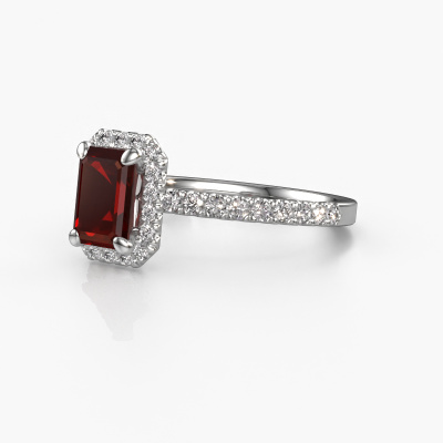 Bovenstaande verlovingsring heeft de naam Miranda eme. Dit type verlovingsring noemen we een halo ring. De verlovingsring is uitgevoerd in 14 Carat witgoud en heeft als middensteen een smaragd geslepen granaat ter grootte van 7x5 mm en eromheen zijn kleine diamanten gezet. Het bijzondere van deze klassieke witgouden halo verlovingsring zijn de kleinere edelstenen die rondom de grote granaat zijn gezet. Dat is ook waar deze mooie verlovingsring zijn naam door heeft gekregen: halo betekent lichtkrans en dat is ook waar de kleinere edelstenen voor zorgen. Deze kleinere edelstenen moeten dan echter wel allen op dezelfde manier geplaatst zijn, zodat het licht niet doorbroken wordt in de granaat en er inderdaad een prachtige lichtkrans gecreëerd wordt. En daar zorgen onze meestergoudsmeden voor. Met uiterste precisie wordt iedere zorgvuldig geselecteerde granaat met de hand in de verlovingsring geplaatst. Steeds opnieuw wordt de verlovingsring tegen het licht gehouden om te zien of het speciale effect nog steeds zichtbaar is. Het resultaat is een unieke verlovingsring, waarbij de gekozen granaat letterlijk het stralende middelpunt wordt. Je kunt je voorstellen dat deze verlovingsring werkelijk een betekenisvolle verlovingsring is om aan jouw liefde voor het leven te schenken! Op de dag dat jij laat zien dat zij jouw stralende middelpunt is!Door het gebruik van de modernste technieken, gecombineerd met ambachtelijk vakmanschap kunnen wij alle verlovingsringen zelf in ons atelier maken. Ieder sieraad wordt pas gemaakt nadat deze besteld is. Dit heeft als bijkomend voordeel dat we kunnen leveren tegen een prijs die je nergens anders tegenkomt.Iedere dag is ons team van goudsmeden en sieradenontwerpers aan het werk om nieuwe sieraden te creëren. Het kan zijn dat je ergens een klassieke verlovingsring gezien hebt, die je als basis wilt nemen bij het ontwerpen van jouw unieke ring. Neem gerust contact met ons op en we zullen je een aanbod doen, waar je vrijwel zeker verwonderd zult zijn over de kwaliteit en de prijs.Om het voor jou makkelijker te maken kun je ieder besteld sieraad binnen 30 dagen na aflevering eenvoudig weer retour sturen.
