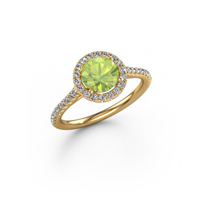 Bovenstaande verlovingsring heeft de naam Seline rnd 2. Dit type verlovingsring noemen we een halo ring. De verlovingsring is uitgevoerd in 14 Carat goud en heeft als middensteen een ronde peridoot ter grootte van 6.5 mm en eromheen zijn kleine lab-grown diamanten gezet. Het bijzondere van deze exclusieve gouden halo verlovingsring zijn de kleinere edelstenen die rondom de grote peridoot zijn gezet. Dat is ook waar deze mooie verlovingsring zijn naam door heeft gekregen: halo betekent lichtkrans en dat is ook waar de kleinere edelstenen voor zorgen. Deze kleinere edelstenen moeten dan echter wel allen op dezelfde manier geplaatst zijn, zodat het licht niet doorbroken wordt in de peridoot en er inderdaad een prachtige lichtkrans gecreëerd wordt. En daar zorgen onze meestergoudsmeden voor. Met uiterste precisie wordt iedere zorgvuldig geselecteerde peridoot met de hand in de verlovingsring geplaatst. Steeds opnieuw wordt de verlovingsring tegen het licht gehouden om te zien of het speciale effect nog steeds zichtbaar is. Het resultaat is een unieke verlovingsring, waarbij de gekozen peridoot letterlijk het stralende middelpunt wordt. Je kunt je voorstellen dat deze verlovingsring werkelijk een betekenisvolle verlovingsring is om aan jouw liefde voor het leven te schenken! Op de dag dat jij laat zien dat zij jouw stralende middelpunt is!Onze goudsmeden vervaardigen pas je Seline rnd 2 verlovingsring, zodra je deze besteld hebt. We hebben geen voorraden. Het voordeel hiervan is dat we de voorraad niet door hoeven te berekenen in de prijs, en kunnen daardoor sieraden leveren tegen een bijzonder lage prijs.Ons team is iedere dag weer bezig om nieuwe ontwerpen toe te voegen, in samenwerking met onze designers en goudsmeden wordt gekeken hoe we tot het mooiste ontwerp kunnen komen. Wij doen ons best om tot een zo gevarieerd mogelijk aanbod te komen. Wellicht heb je zelf al een mooi idee van een sieraad dat je ooit wel eens gezien hebt. Neem dan eens vrijblijvend contact met ons op. Wij maken een offerte voor je op waarbij wij vrij zeker zijn dat we wat betreft kwaliteit en prijs jou versteld zullen laten staan.Om het voor jou makkelijker te maken kun je ieder besteld sieraad binnen 30 dagen na aflevering eenvoudig weer retour sturen.