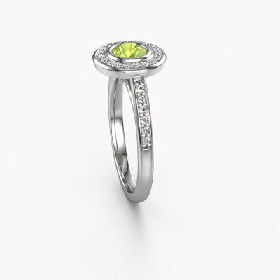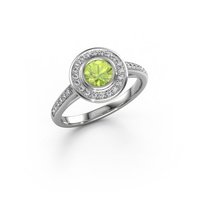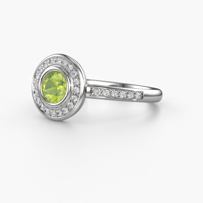 Bovenstaande verlovingsring heeft de naam Noud 2 RND. Dit type verlovingsring noemen we een halo ring. De verlovingsring is uitgevoerd in platina en heeft als middensteen een ronde peridoot ter grootte van 5 mm en eromheen zijn kleine diamanten gezet. Het bijzondere van deze luxe platina halo verlovingsring zijn de kleinere edelstenen die rondom de grote peridoot zijn gezet. Dat is ook waar deze mooie verlovingsring zijn naam door heeft gekregen: halo betekent lichtkrans en dat is ook waar de kleinere edelstenen voor zorgen. Deze kleinere edelstenen moeten dan echter wel allen op dezelfde manier geplaatst zijn, zodat het licht niet doorbroken wordt in de peridoot en er inderdaad een prachtige lichtkrans gecreëerd wordt. En daar zorgen onze meestergoudsmeden voor. Met uiterste precisie wordt iedere zorgvuldig geselecteerde peridoot met de hand in de verlovingsring geplaatst. Steeds opnieuw wordt de verlovingsring tegen het licht gehouden om te zien of het speciale effect nog steeds zichtbaar is. Het resultaat is een unieke verlovingsring, waarbij de gekozen peridoot letterlijk het stralende middelpunt wordt. Je kunt je voorstellen dat deze verlovingsring werkelijk een betekenisvolle verlovingsring is om aan jouw liefde voor het leven te schenken! Op de dag dat jij laat zien dat zij jouw stralende middelpunt is!Door het gebruik van de modernste technieken, gecombineerd met ambachtelijk vakmanschap kunnen wij alle verlovingsringen zelf in ons atelier maken. Ieder sieraad wordt pas gemaakt nadat deze besteld is. Dit heeft als bijkomend voordeel dat we kunnen leveren tegen een prijs die je nergens anders tegenkomt.Heb je zelf een specifieke verlovingsring ergens gezien, die je graag aan jouw geliefde zou willen geven? Bespreek gerust jouw ideeën met onze sieradenontwerpers, want wij zetten graag jouw ontwerp om tot een luxe verlovingsring. Je kunt tijdens het ontwerpproces steeds meekijken, omdat wij met 3D tekeningen werken. Je krijgt hierdoor al een realistische indruk van hoe jouw ontwerp er in werkelijkheid uit komt te zien. Daarbij kun je een dummy vooraf bestellen. Een dummy is een kunststof ring, die precies dezelfde vormen heeft als jouw uiteindelijke ontwerp. Je kunt deze passen en zien of de breedte en dikte bijvoorbeeld naar wens zijn. Wij sturen je graag een vrijblijvende offerte, waarbij je ongetwijfeld versteld zult staan over de prijs en de kwaliteit van de ring en edelstenen.Om het voor jou makkelijker te maken kun je ieder besteld sieraad binnen 30 dagen na aflevering eenvoudig weer retour sturen.
