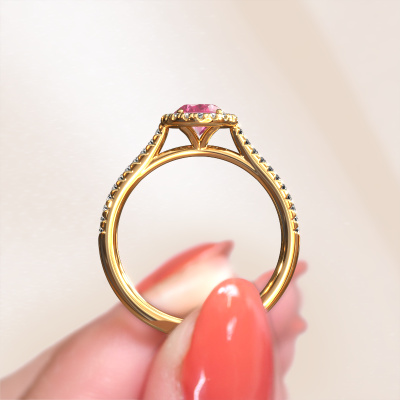 Bovenstaande verlovingsring heeft de naam Seline ovl 2. Dit type verlovingsring noemen we een halo ring. De verlovingsring is uitgevoerd in 14 Carat goud en heeft als middensteen een ovale roze saffier ter grootte van 7x5 mm en eromheen zijn kleine diamanten gezet. Het bijzondere van deze exclusieve gouden halo verlovingsring zijn de kleinere edelstenen die rondom de grote roze saffier zijn gezet. Dat is ook waar deze mooie verlovingsring zijn naam door heeft gekregen: halo betekent lichtkrans en dat is ook waar de kleinere edelstenen voor zorgen. Deze kleinere edelstenen moeten dan echter wel allen op dezelfde manier geplaatst zijn, zodat het licht niet doorbroken wordt in de roze saffier en er inderdaad een prachtige lichtkrans gecreëerd wordt. En daar zorgen onze meestergoudsmeden voor. Met uiterste precisie wordt iedere zorgvuldig geselecteerde roze saffier met de hand in de verlovingsring geplaatst. Steeds opnieuw wordt de verlovingsring tegen het licht gehouden om te zien of het speciale effect nog steeds zichtbaar is. Het resultaat is een unieke verlovingsring, waarbij de gekozen roze saffier letterlijk het stralende middelpunt wordt. Je kunt je voorstellen dat deze verlovingsring werkelijk een betekenisvolle verlovingsring is om aan jouw liefde voor het leven te schenken! Op de dag dat jij laat zien dat zij jouw stralende middelpunt is!Onze goudsmeden vervaardigen pas je Seline ovl 2 verlovingsring, zodra je deze besteld hebt. We hebben geen voorraden. Het voordeel hiervan is dat we de voorraad niet door hoeven te berekenen in de prijs, en kunnen daardoor sieraden leveren tegen een bijzonder lage prijs.Ons team is iedere dag weer bezig om nieuwe ontwerpen toe te voegen, in samenwerking met onze designers en goudsmeden wordt gekeken hoe we tot het mooiste ontwerp kunnen komen. Wij doen ons best om tot een zo gevarieerd mogelijk aanbod te komen. Wellicht heb je zelf al een mooi idee van een sieraad dat je ooit wel eens gezien hebt. Neem dan eens vrijblijvend contact met ons op. Wij maken een offerte voor je op waarbij wij vrij zeker zijn dat we wat betreft kwaliteit en prijs jou versteld zullen laten staan.Om het voor jou makkelijker te maken kun je ieder besteld sieraad binnen 30 dagen na aflevering eenvoudig weer retour sturen.