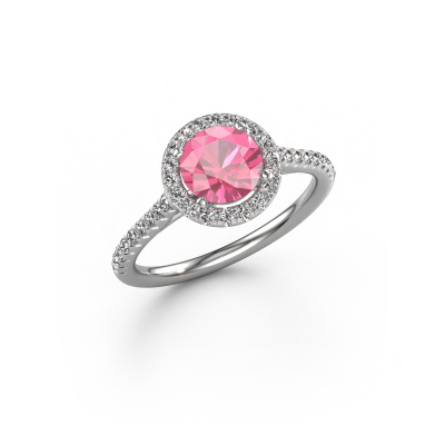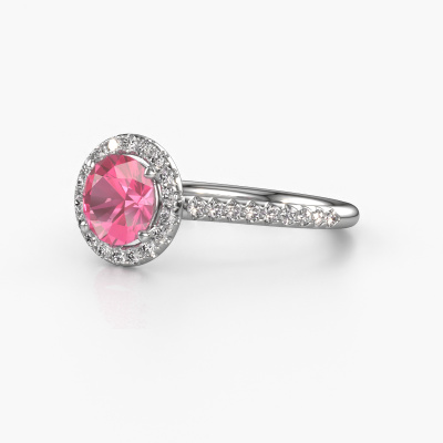 Bovenstaande verlovingsring heeft de naam Seline rnd 2. Dit type verlovingsring noemen we een halo ring. De verlovingsring is uitgevoerd in 14 Carat witgoud en heeft als middensteen een ronde roze saffier ter grootte van 6.5 mm en eromheen zijn kleine lab-grown diamanten gezet. Het bijzondere van deze exclusieve witgouden halo verlovingsring zijn de kleinere edelstenen die rondom de grote roze saffier zijn gezet. Dat is ook waar deze mooie verlovingsring zijn naam door heeft gekregen: halo betekent lichtkrans en dat is ook waar de kleinere edelstenen voor zorgen. Deze kleinere edelstenen moeten dan echter wel allen op dezelfde manier geplaatst zijn, zodat het licht niet doorbroken wordt in de roze saffier en er inderdaad een prachtige lichtkrans gecreëerd wordt. En daar zorgen onze meestergoudsmeden voor. Met uiterste precisie wordt iedere zorgvuldig geselecteerde roze saffier met de hand in de verlovingsring geplaatst. Steeds opnieuw wordt de verlovingsring tegen het licht gehouden om te zien of het speciale effect nog steeds zichtbaar is. Het resultaat is een unieke verlovingsring, waarbij de gekozen roze saffier letterlijk het stralende middelpunt wordt. Je kunt je voorstellen dat deze verlovingsring werkelijk een betekenisvolle verlovingsring is om aan jouw liefde voor het leven te schenken! Op de dag dat jij laat zien dat zij jouw stralende middelpunt is!Onze goudsmeden vervaardigen pas je Seline rnd 2 verlovingsring, zodra je deze besteld hebt. We hebben geen voorraden. Het voordeel hiervan is dat we de voorraad niet door hoeven te berekenen in de prijs, en kunnen daardoor sieraden leveren tegen een bijzonder lage prijs.Ons team is iedere dag weer bezig om nieuwe ontwerpen toe te voegen, in samenwerking met onze designers en goudsmeden wordt gekeken hoe we tot het mooiste ontwerp kunnen komen. Wij doen ons best om tot een zo gevarieerd mogelijk aanbod te komen. Wellicht heb je zelf al een mooi idee van een sieraad dat je ooit wel eens gezien hebt. Neem dan eens vrijblijvend contact met ons op. Wij maken een offerte voor je op waarbij wij vrij zeker zijn dat we wat betreft kwaliteit en prijs jou versteld zullen laten staan.Om het voor jou makkelijker te maken kun je ieder besteld sieraad binnen 30 dagen na aflevering eenvoudig weer retour sturen.