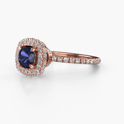 Bovenstaande verlovingsring heeft de naam Talitha CUS. Dit type verlovingsring noemen we een halo ring. De verlovingsring is uitgevoerd in 14 Carat rosé goud en heeft als middensteen een cushion saffier ter grootte van 5 mm en eromheen zijn kleine diamanten gezet. Het bijzondere van deze traditionele rosé gouden halo verlovingsring zijn de kleinere edelstenen die rondom de grote saffier zijn gezet. Dat is ook waar deze mooie verlovingsring zijn naam door heeft gekregen: halo betekent lichtkrans en dat is ook waar de kleinere edelstenen voor zorgen. Deze kleinere edelstenen moeten dan echter wel allen op dezelfde manier geplaatst zijn, zodat het licht niet doorbroken wordt in de saffier en er inderdaad een prachtige lichtkrans gecreëerd wordt. En daar zorgen onze meestergoudsmeden voor. Met uiterste precisie wordt iedere zorgvuldig geselecteerde saffier met de hand in de verlovingsring geplaatst. Steeds opnieuw wordt de verlovingsring tegen het licht gehouden om te zien of het speciale effect nog steeds zichtbaar is. Het resultaat is een unieke verlovingsring, waarbij de gekozen saffier letterlijk het stralende middelpunt wordt. Je kunt je voorstellen dat deze verlovingsring werkelijk een betekenisvolle verlovingsring is om aan jouw liefde voor het leven te schenken! Op de dag dat jij laat zien dat zij jouw stralende middelpunt is!Omdat wij zelf alle verlovingsring maken en direct aan jou leveren kunnen wij je een verlovingsring leveren tegen een prijs die je nergens anders zult tegenkomen. Een ring wordt pas gemaakt als we een bestelling krijgen, hierdoor hebben wij geen dure voorraden en kunnen wij je de beste prijs garanderen. Wij begrijpen dat het kopen van een verlovingsring online spannend is en willen daarom je zoveel mogelijk informeren over alle specifieke eigenschappen van de ring die jij koopt.Iedere dag is ons team van goudsmeden en sieradenontwerpers aan het werk om nieuwe sieraden te creëren. Het kan zijn dat je ergens een traditionele verlovingsring gezien hebt, die je als basis wilt nemen bij het ontwerpen van jouw unieke ring. Neem gerust contact met ons op en we zullen je een aanbod doen, waar je vrijwel zeker verwonderd zult zijn over de kwaliteit en de prijs.Om het voor jou makkelijker te maken kun je ieder besteld sieraad binnen 30 dagen na aflevering eenvoudig weer retour sturen.
