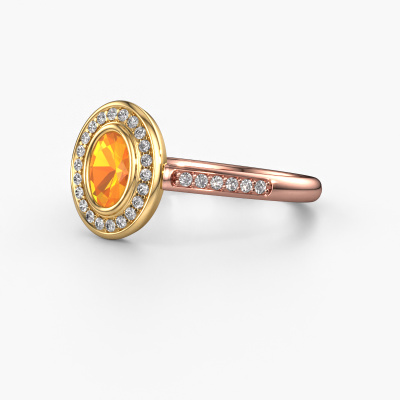 Bovenstaande verlovingsring heeft de naam Noud 2 OVL. Dit type verlovingsring noemen we een halo ring. De verlovingsring is uitgevoerd in 14 Carat rosé goud en heeft als middensteen een ovale citrien ter grootte van 6x4 mm en eromheen zijn kleine lab-grown diamanten gezet. Het bijzondere van deze exclusieve rosé gouden halo verlovingsring zijn de kleinere edelstenen die rondom de grote citrien zijn gezet. Dat is ook waar deze mooie verlovingsring zijn naam door heeft gekregen: halo betekent lichtkrans en dat is ook waar de kleinere edelstenen voor zorgen. Deze kleinere edelstenen moeten dan echter wel allen op dezelfde manier geplaatst zijn, zodat het licht niet doorbroken wordt in de citrien en er inderdaad een prachtige lichtkrans gecreëerd wordt. En daar zorgen onze meestergoudsmeden voor. Met uiterste precisie wordt iedere zorgvuldig geselecteerde citrien met de hand in de verlovingsring geplaatst. Steeds opnieuw wordt de verlovingsring tegen het licht gehouden om te zien of het speciale effect nog steeds zichtbaar is. Het resultaat is een unieke verlovingsring, waarbij de gekozen citrien letterlijk het stralende middelpunt wordt. Je kunt je voorstellen dat deze verlovingsring werkelijk een betekenisvolle verlovingsring is om aan jouw liefde voor het leven te schenken! Op de dag dat jij laat zien dat zij jouw stralende middelpunt is!Door onze modernste technieken kunnen wij met uiterste precisie prachtige sieraden te ontwerpen en voor jou personaliseren in de hoogste juwelierskwaliteit. Tegelijkertijd zijn onze verlovingsringen altijd 30% goedkoper dan bij een andere juwelier. Dit komt doordat alle verlovingsringen pas vervaardigd worden op het moment dat deze besteld wordt en we daardoor geen dure voorraden hoeven te hanteren. Mocht je aan een bepaald budget gebonden zijn, kunnen we je graag adviseren welke combinatie je het beste kunt kiezen.Heb je zelf een specifieke verlovingsring ergens gezien, die je graag aan jouw geliefde zou willen geven? Bespreek gerust jouw ideeën met onze sieradenontwerpers, want wij zetten graag jouw ontwerp om tot een exclusieve verlovingsring. Je kunt tijdens het ontwerpproces steeds meekijken, omdat wij met 3D tekeningen werken. Je krijgt hierdoor al een realistische indruk van hoe jouw ontwerp er in werkelijkheid uit komt te zien. Daarbij kun je een dummy vooraf bestellen. Een dummy is een kunststof ring, die precies dezelfde vormen heeft als jouw uiteindelijke ontwerp. Je kunt deze passen en zien of de breedte en dikte bijvoorbeeld naar wens zijn. Wij sturen je graag een vrijblijvende offerte, waarbij je ongetwijfeld versteld zult staan over de prijs en de kwaliteit van de ring en edelstenen.Om het voor jou makkelijker te maken kun je ieder besteld sieraad binnen 30 dagen na aflevering eenvoudig weer retour sturen.