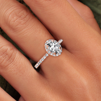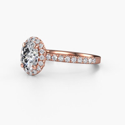 Bovenstaande verlovingsring heeft de naam Miranda OVL. Dit type verlovingsring noemen we een halo ring. De verlovingsring is uitgevoerd in 14 Carat rosé goud en heeft als middensteen een ovale diamant ter grootte van 0.80 crt en eromheen zijn kleine lab-grown diamanten gezet. Het bijzondere van deze exclusieve rosé gouden halo verlovingsring zijn de kleinere edelstenen die rondom de grote diamant zijn gezet. Dat is ook waar deze mooie verlovingsring zijn naam door heeft gekregen: halo betekent lichtkrans en dat is ook waar de kleinere edelstenen voor zorgen. Deze kleinere edelstenen moeten dan echter wel allen op dezelfde manier geplaatst zijn, zodat het licht niet doorbroken wordt in de diamant en er inderdaad een prachtige lichtkrans gecreëerd wordt. En daar zorgen onze meestergoudsmeden voor. Met uiterste precisie wordt iedere zorgvuldig geselecteerde diamant met de hand in de verlovingsring geplaatst. Steeds opnieuw wordt de verlovingsring tegen het licht gehouden om te zien of het speciale effect nog steeds zichtbaar is. Het resultaat is een unieke verlovingsring, waarbij de gekozen diamant letterlijk het stralende middelpunt wordt. Je kunt je voorstellen dat deze verlovingsring werkelijk een betekenisvolle verlovingsring is om aan jouw liefde voor het leven te schenken! Op de dag dat jij laat zien dat zij jouw stralende middelpunt is!Door het gebruik van de modernste technieken, gecombineerd met ambachtelijk vakmanschap kunnen wij alle verlovingsringen zelf in ons atelier maken. Ieder sieraad wordt pas gemaakt nadat deze besteld is. Dit heeft als bijkomend voordeel dat we kunnen leveren tegen een prijs die je nergens anders tegenkomt.Iedere dag is ons team van goudsmeden en sieradenontwerpers aan het werk om nieuwe sieraden te creëren. Het kan zijn dat je ergens een exclusieve verlovingsring gezien hebt, die je als basis wilt nemen bij het ontwerpen van jouw unieke ring. Neem gerust contact met ons op en we zullen je een aanbod doen, waar je vrijwel zeker verwonderd zult zijn over de kwaliteit en de prijs.Om het voor jou makkelijker te maken kun je ieder besteld sieraad binnen 30 dagen na aflevering eenvoudig weer retour sturen.