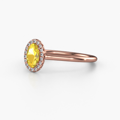 Bovenstaande verlovingsring heeft de naam Seline ovl 1. Dit type verlovingsring noemen we een halo ring. De verlovingsring is uitgevoerd in 14 Carat rosé goud en heeft als middensteen een ovale gele saffier ter grootte van 6x4 mm en eromheen zijn kleine diamanten gezet. Het bijzondere van deze klassieke rosé gouden halo verlovingsring zijn de kleinere edelstenen die rondom de grote gele saffier zijn gezet. Dat is ook waar deze mooie verlovingsring zijn naam door heeft gekregen: halo betekent lichtkrans en dat is ook waar de kleinere edelstenen voor zorgen. Deze kleinere edelstenen moeten dan echter wel allen op dezelfde manier geplaatst zijn, zodat het licht niet doorbroken wordt in de gele saffier en er inderdaad een prachtige lichtkrans gecreëerd wordt. En daar zorgen onze meestergoudsmeden voor. Met uiterste precisie wordt iedere zorgvuldig geselecteerde gele saffier met de hand in de verlovingsring geplaatst. Steeds opnieuw wordt de verlovingsring tegen het licht gehouden om te zien of het speciale effect nog steeds zichtbaar is. Het resultaat is een unieke verlovingsring, waarbij de gekozen gele saffier letterlijk het stralende middelpunt wordt. Je kunt je voorstellen dat deze verlovingsring werkelijk een betekenisvolle verlovingsring is om aan jouw liefde voor het leven te schenken! Op de dag dat jij laat zien dat zij jouw stralende middelpunt is!Wellicht is het je opgevallen dat onze prijzen gemiddeld 30% lager liggen dan bij een andere juwelier. En dat terwijl de kwaliteit in de meeste gevallen nog beter is! Dit komt doordat onze goudsmeden je verlovingsring direct in ons eigen atelier vervaardigen. Hierdoor hoeven we geen dure voorraden te hanteren en kunnen we ieder gewenst detail direct op jouw verlovingsring aanbrengen.Ons team is iedere dag weer bezig om nieuwe ontwerpen toe te voegen, in samenwerking met onze designers en goudsmeden wordt gekeken hoe we tot het mooiste ontwerp kunnen komen. Wij doen ons best om tot een zo gevarieerd mogelijk aanbod te komen. Wellicht heb je zelf al een mooi idee van een sieraad dat je ooit wel eens gezien hebt. Neem dan eens vrijblijvend contact met ons op. Wij maken een offerte voor je op waarbij wij vrij zeker zijn dat we wat betreft kwaliteit en prijs jou versteld zullen laten staan.Om het voor jou makkelijker te maken kun je ieder besteld sieraad binnen 30 dagen na aflevering eenvoudig weer retour sturen.