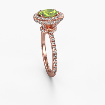 Bovenstaande verlovingsring heeft de naam Talitha OVL. Dit type verlovingsring noemen we een halo ring. De verlovingsring is uitgevoerd in 14 Carat rosé goud en heeft als middensteen een ovale peridoot ter grootte van 7x5 mm en eromheen zijn kleine lab-grown diamanten gezet. Het bijzondere van deze klassieke rosé gouden halo verlovingsring zijn de kleinere edelstenen die rondom de grote peridoot zijn gezet. Dat is ook waar deze mooie verlovingsring zijn naam door heeft gekregen: halo betekent lichtkrans en dat is ook waar de kleinere edelstenen voor zorgen. Deze kleinere edelstenen moeten dan echter wel allen op dezelfde manier geplaatst zijn, zodat het licht niet doorbroken wordt in de peridoot en er inderdaad een prachtige lichtkrans gecreëerd wordt. En daar zorgen onze meestergoudsmeden voor. Met uiterste precisie wordt iedere zorgvuldig geselecteerde peridoot met de hand in de verlovingsring geplaatst. Steeds opnieuw wordt de verlovingsring tegen het licht gehouden om te zien of het speciale effect nog steeds zichtbaar is. Het resultaat is een unieke verlovingsring, waarbij de gekozen peridoot letterlijk het stralende middelpunt wordt. Je kunt je voorstellen dat deze verlovingsring werkelijk een betekenisvolle verlovingsring is om aan jouw liefde voor het leven te schenken! Op de dag dat jij laat zien dat zij jouw stralende middelpunt is!Door het gebruik van de modernste technieken, gecombineerd met ambachtelijk vakmanschap kunnen wij alle verlovingsringen zelf in ons atelier maken. Ieder sieraad wordt pas gemaakt nadat deze besteld is. Dit heeft als bijkomend voordeel dat we kunnen leveren tegen een prijs die je nergens anders tegenkomt.Iedere dag is ons team van goudsmeden en sieradenontwerpers aan het werk om nieuwe sieraden te creëren. Het kan zijn dat je ergens een klassieke verlovingsring gezien hebt, die je als basis wilt nemen bij het ontwerpen van jouw unieke ring. Neem gerust contact met ons op en we zullen je een aanbod doen, waar je vrijwel zeker verwonderd zult zijn over de kwaliteit en de prijs.Om het voor jou makkelijker te maken kun je ieder besteld sieraad binnen 30 dagen na aflevering eenvoudig weer retour sturen.