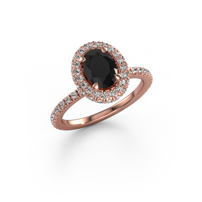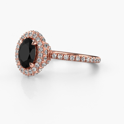 Bovenstaande verlovingsring heeft de naam Talitha OVL. Dit type verlovingsring noemen we een halo ring. De verlovingsring is uitgevoerd in 14 Carat rosé goud en heeft als middensteen een ovale zwarte diamant ter grootte van 1.05 crt en eromheen zijn kleine lab-grown diamanten gezet. Het bijzondere van deze klassieke rosé gouden halo verlovingsring zijn de kleinere edelstenen die rondom de grote zwarte diamant zijn gezet. Dat is ook waar deze mooie verlovingsring zijn naam door heeft gekregen: halo betekent lichtkrans en dat is ook waar de kleinere edelstenen voor zorgen. Deze kleinere edelstenen moeten dan echter wel allen op dezelfde manier geplaatst zijn, zodat het licht niet doorbroken wordt in de zwarte diamant en er inderdaad een prachtige lichtkrans gecreëerd wordt. En daar zorgen onze meestergoudsmeden voor. Met uiterste precisie wordt iedere zorgvuldig geselecteerde zwarte diamant met de hand in de verlovingsring geplaatst. Steeds opnieuw wordt de verlovingsring tegen het licht gehouden om te zien of het speciale effect nog steeds zichtbaar is. Het resultaat is een unieke verlovingsring, waarbij de gekozen zwarte diamant letterlijk het stralende middelpunt wordt. Je kunt je voorstellen dat deze verlovingsring werkelijk een betekenisvolle verlovingsring is om aan jouw liefde voor het leven te schenken! Op de dag dat jij laat zien dat zij jouw stralende middelpunt is!Door het gebruik van de modernste technieken, gecombineerd met ambachtelijk vakmanschap kunnen wij alle verlovingsringen zelf in ons atelier maken. Ieder sieraad wordt pas gemaakt nadat deze besteld is. Dit heeft als bijkomend voordeel dat we kunnen leveren tegen een prijs die je nergens anders tegenkomt.Iedere dag is ons team van goudsmeden en sieradenontwerpers aan het werk om nieuwe sieraden te creëren. Het kan zijn dat je ergens een klassieke verlovingsring gezien hebt, die je als basis wilt nemen bij het ontwerpen van jouw unieke ring. Neem gerust contact met ons op en we zullen je een aanbod doen, waar je vrijwel zeker verwonderd zult zijn over de kwaliteit en de prijs.Om het voor jou makkelijker te maken kun je ieder besteld sieraad binnen 30 dagen na aflevering eenvoudig weer retour sturen.