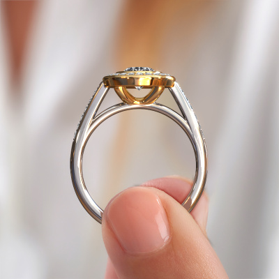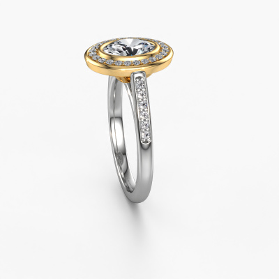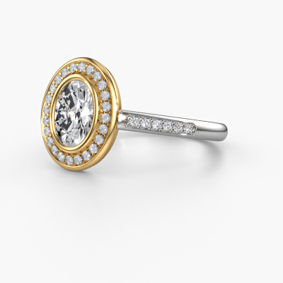 Bovenstaande verlovingsring heeft de naam Noud 2 OVL. Dit type verlovingsring noemen we een halo ring. De verlovingsring is uitgevoerd in 14 Carat witgoud en heeft als middensteen een ovale diamant ter grootte van 0.80 crt en eromheen zijn kleine lab-grown diamanten gezet. Het bijzondere van deze exclusieve witgouden halo verlovingsring zijn de kleinere edelstenen die rondom de grote diamant zijn gezet. Dat is ook waar deze mooie verlovingsring zijn naam door heeft gekregen: halo betekent lichtkrans en dat is ook waar de kleinere edelstenen voor zorgen. Deze kleinere edelstenen moeten dan echter wel allen op dezelfde manier geplaatst zijn, zodat het licht niet doorbroken wordt in de diamant en er inderdaad een prachtige lichtkrans gecreëerd wordt. En daar zorgen onze meestergoudsmeden voor. Met uiterste precisie wordt iedere zorgvuldig geselecteerde diamant met de hand in de verlovingsring geplaatst. Steeds opnieuw wordt de verlovingsring tegen het licht gehouden om te zien of het speciale effect nog steeds zichtbaar is. Het resultaat is een unieke verlovingsring, waarbij de gekozen diamant letterlijk het stralende middelpunt wordt. Je kunt je voorstellen dat deze verlovingsring werkelijk een betekenisvolle verlovingsring is om aan jouw liefde voor het leven te schenken! Op de dag dat jij laat zien dat zij jouw stralende middelpunt is!Door onze modernste technieken kunnen wij met uiterste precisie prachtige sieraden te ontwerpen en voor jou personaliseren in de hoogste juwelierskwaliteit. Tegelijkertijd zijn onze verlovingsringen altijd 30% goedkoper dan bij een andere juwelier. Dit komt doordat alle verlovingsringen pas vervaardigd worden op het moment dat deze besteld wordt en we daardoor geen dure voorraden hoeven te hanteren. Mocht je aan een bepaald budget gebonden zijn, kunnen we je graag adviseren welke combinatie je het beste kunt kiezen.Heb je zelf een specifieke verlovingsring ergens gezien, die je graag aan jouw geliefde zou willen geven? Bespreek gerust jouw ideeën met onze sieradenontwerpers, want wij zetten graag jouw ontwerp om tot een exclusieve verlovingsring. Je kunt tijdens het ontwerpproces steeds meekijken, omdat wij met 3D tekeningen werken. Je krijgt hierdoor al een realistische indruk van hoe jouw ontwerp er in werkelijkheid uit komt te zien. Daarbij kun je een dummy vooraf bestellen. Een dummy is een kunststof ring, die precies dezelfde vormen heeft als jouw uiteindelijke ontwerp. Je kunt deze passen en zien of de breedte en dikte bijvoorbeeld naar wens zijn. Wij sturen je graag een vrijblijvende offerte, waarbij je ongetwijfeld versteld zult staan over de prijs en de kwaliteit van de ring en edelstenen.Om het voor jou makkelijker te maken kun je ieder besteld sieraad binnen 30 dagen na aflevering eenvoudig weer retour sturen.