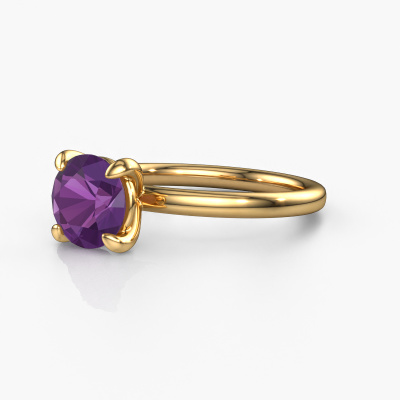 Bovenstaande verlovingsring heeft de naam Simone RND 1. Dit type verlovingsring noemen we een solitaire verlovingsring omdat hij een enkele edelsteen bevat. De verlovingsring is uitgevoerd in 14 Carat goud en heeft een ronde amethist ter grootte van 7.3 mm. Deze schitterende klassieke gouden solitaire ring heeft een prachtige ronde amethist om je aanzoek heel speciaal te maken. De open chatonzetting zorgt voor een prachtige lichtinval op de diamant. Wist je dat de diamant bijvoorbeeld symbool staat voor eeuwige liefde en trouw? Juist daarom is het een prachtige edelsteen om in het middelpunt te stellen. Onze goudsmid plaatst met veel zorgvuldigheid de gekozen edelsteen hoog op de ring, waardoor het een echte eyecatcher is. Ieder juweel is speciaal voor jou gemaakt, met aandacht voor detail en design.Door het gebruik van de modernste technieken, gecombineerd met ambachtelijk vakmanschap kunnen wij alle verlovingsringen zelf in ons atelier maken. Ieder sieraad wordt pas gemaakt nadat deze besteld is. Dit heeft als bijkomend voordeel dat we kunnen leveren tegen een prijs die je nergens anders tegenkomt.Ons team ontwerpt dagelijks nieuwe ringen in diverse stijlen. Heb je zelf een solitaire verlovingsring ergens gezien, die jij het liefst aan jouw geliefde zou willen geven? Je kunt altijd jouw ideeën en ontwerp met onze sieradenontwerpers bespreken, want wij zetten graag jouw ontwerp om tot een klassieke verlovingsring. Je kunt tijdens het ontwerpproces steeds meekijken, omdat het ontwerp in een zeer gedetailleerde 3D tekening wordt omgezet. Daarbij kun je een dummy bestellen van het uiteindelijke ontwerp. Een dummy is een kunststof ring, die precies dezelfde vormen heeft als jouw uiteindelijke ontwerp. Je kunt deze passen en zien of de ontworpen verlovingsring helemaal naar jouw wens is. Wij sturen je graag een vrijblijvende offerte, waarbij je ongetwijfeld versteld zult staan over de prijs en de kwaliteit van de ring en edelstenen.Om het voor jou makkelijker te maken kun je ieder besteld sieraad binnen 30 dagen na aflevering eenvoudig weer retour sturen.