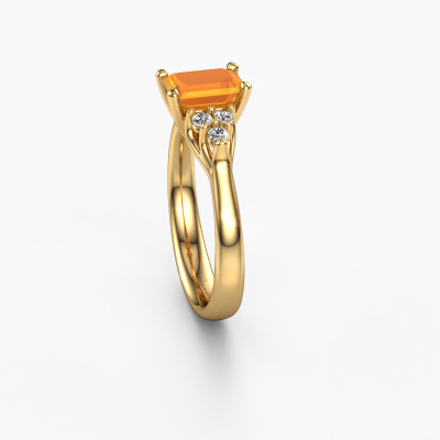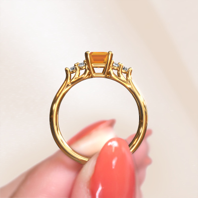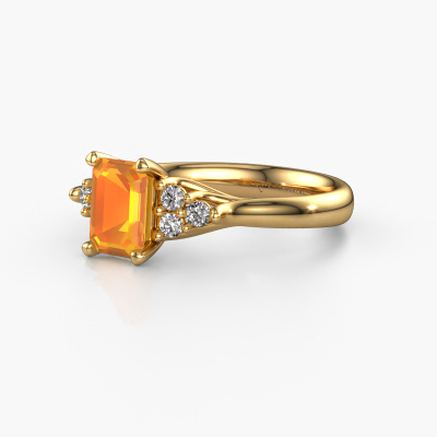 Bovenstaande verlovingsring heeft de naam Monika EME. Dit type verlovingsring noemen we een solitaire verlovingsring omdat hij een enkele edelsteen bevat. De verlovingsring is uitgevoerd in 14 Carat goud en heeft een smaragd geslepen citrien ter grootte van 7x5 mm. Deze schitterende klassieke gouden solitaire ring heeft een prachtige smaragd geslepen citrien om je aanzoek heel speciaal te maken. De open chatonzetting zorgt voor een prachtige lichtinval op de diamant. Wist je dat de diamant bijvoorbeeld symbool staat voor eeuwige liefde en trouw? Juist daarom is het een prachtige edelsteen om in het middelpunt te stellen. Onze goudsmid plaatst met veel zorgvuldigheid de gekozen edelsteen hoog op de ring, waardoor het een echte eyecatcher is. Ieder juweel wordt speciaal voor jou gemaakt door onze meester goudsmeden in ons eigen atelier.Door onze modernste technieken kunnen wij met uiterste precisie prachtige sieraden te ontwerpen en voor jou personaliseren in de hoogste juwelierskwaliteit. Tegelijkertijd zijn onze verlovingsringen altijd 30% goedkoper dan bij een andere juwelier. Dit komt doordat alle verlovingsringen pas vervaardigd worden op het moment dat deze besteld wordt en we daardoor geen dure voorraden hoeven te hanteren. Mocht je aan een bepaald budget gebonden zijn, kunnen we je graag adviseren welke combinatie je het beste kunt kiezen.Ons team is iedere dag weer bezig om nieuwe ontwerpen toe te voegen, in samenwerking met onze designers en goudsmeden wordt gekeken hoe we tot het mooiste ontwerp kunnen komen. Wij doen ons best om tot een zo gevarieerd mogelijk aanbod te komen. Wellicht heb je zelf al een mooi idee van een sieraad dat je ooit wel eens gezien hebt. Neem dan eens vrijblijvend contact met ons op. Wij maken een offerte voor je op waarbij wij vrij zeker zijn dat we wat betreft kwaliteit en prijs jou versteld zullen laten staan.Om het voor jou makkelijker te maken kun je ieder besteld sieraad binnen 30 dagen na aflevering eenvoudig weer retour sturen.
