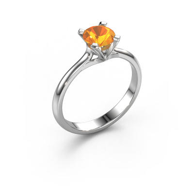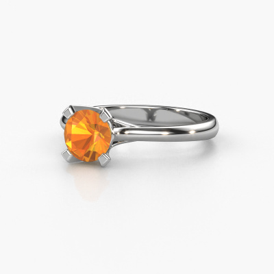Bovenstaande verlovingsring heeft de naam Isa 1. Dit type verlovingsring noemen we een solitaire verlovingsring omdat hij een enkele edelsteen bevat. De verlovingsring is uitgevoerd in platina en heeft een ronde citrien ter grootte van 5.7 mm. Deze schitterende klassieke platina solitaire ring heeft een prachtige ronde citrien om je aanzoek heel speciaal te maken. De open chatonzetting zorgt voor een prachtige lichtinval op de diamant. Wist je dat de diamant bijvoorbeeld symbool staat voor eeuwige liefde en trouw? Juist daarom is het een prachtige edelsteen om in het middelpunt te stellen. Onze goudsmid plaatst met veel zorgvuldigheid de gekozen edelsteen hoog op de ring, waardoor het een echte eyecatcher is. Ieder juweel wordt speciaal voor jou gemaakt door onze meester goudsmeden in ons eigen atelier.Door het gebruik van de modernste technieken, gecombineerd met ambachtelijk vakmanschap kunnen wij alle verlovingsringen zelf in ons atelier maken. Ieder sieraad wordt pas gemaakt nadat deze besteld is. Dit heeft als bijkomend voordeel dat we kunnen leveren tegen een prijs die je nergens anders tegenkomt.Heb je zelf een speciale ring in gedachten, die je wellicht ergens gezien hebt? Je kunt je ideeën altijd met ons bespreken, wij zetten graag jouw ontwerp om tot een unieke verlovingsring. Het ontwerp kun je volgen, omdat wij met 3D tekeningen werken. Hierdoor krijg je al een realistische indruk van hoe jouw ontwerp er in het echt uit komt te zien. Wij sturen je graag een vrijblijvende offerte, waarbij je ongetwijfeld verwonderd zult zijn over de prijs in combinatie met de uitstekende kwaliteit die we aanbieden.Om het voor jou makkelijker te maken kun je ieder besteld sieraad binnen 30 dagen na aflevering eenvoudig weer retour sturen.