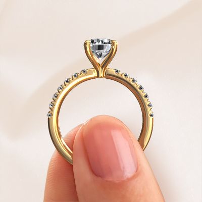 Bovenstaande verlovingsring heeft de naam Crystal RND 2. Dit type verlovingsring noemen we een pavé solitaire verlovingsring omdat hij een enkele middensteen heeft waarbij de banden van de verlovingsring ook volgezet zijn. De verlovingsring is uitgevoerd in de combinatie 14 Carat goud met goud en heeft als middensteen een ronde lab-grown diamant ter grootte van 1.30 crt en in de zijbanden zijn lab-grown diamanten gezet. Ieder juweel is uniek, doordat je deze ring geheel naar eigen wensen kunt samenstellen.Deze klassieke gouden pavé solitaire verlovingsring heeft een schitterende ronde lab-grown diamant als centersteen, waarbij in de band nog meer lab-grown diamanten zijn gezet om de middensteen nog meer te accentueren. Doordat de zetting van de pootjes om de lab-grown diamant open is, vangt de lab-grown diamant het licht van alle kanten op en schittert hierdoor optimaal. Hierboven kun je zien hoe onze goudsmid de verlovingsring heel precies tot in de kleinste details heeft bewerkt, zodat de wat hoger gelegen lab-grown diamant een echte eyecatcher is. Wat een prachtige verlovingsring om te geven bij je aanzoek aan de liefde van jouw leven, aan jouw stralende middelpunt!Onze goudsmeden vervaardigen pas je Crystal RND 2 verlovingsring, zodra je deze besteld hebt. We hebben geen voorraden. Het voordeel hiervan is dat we de voorraad niet door hoeven te berekenen in de prijs, en kunnen daardoor sieraden leveren tegen een bijzonder lage prijs.Ons team ontwerpt dagelijks nieuwe ringen in diverse stijlen. Heb je zelf een pavé solitaire verlovingsring ergens gezien, die jij het liefst aan jouw geliefde zou willen geven? Je kunt altijd jouw ideeën en ontwerp met onze sieradenontwerpers bespreken, want wij zetten graag jouw ontwerp om tot een klassieke verlovingsring. Je kunt tijdens het ontwerpproces steeds meekijken, omdat het ontwerp in een zeer gedetailleerde 3D tekening wordt omgezet. Daarbij kun je een dummy bestellen van het uiteindelijke ontwerp. Een dummy is een kunststof ring, die precies dezelfde vormen heeft als jouw uiteindelijke ontwerp. Je kunt deze passen en zien of de ontworpen verlovingsring helemaal naar jouw wens is. Wij sturen je graag een vrijblijvende offerte, waarbij je ongetwijfeld versteld zult staan over de prijs en de kwaliteit van de ring en edelstenen.Om het voor jou makkelijker te maken kun je ieder besteld sieraad binnen 30 dagen na aflevering eenvoudig weer retour sturen.