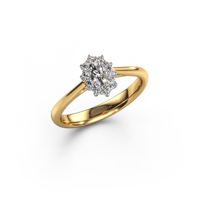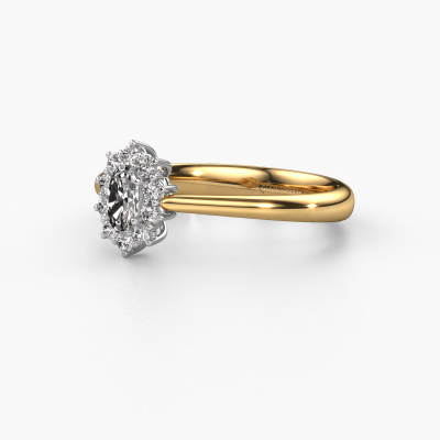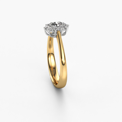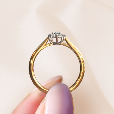 Bovenstaande verlovingsring heeft de naam Leesa 1. Dit type verlovingsring noemen we een Lady Diana ring. Hierbij worden rondom de middensteen in een open zetting allemaal kleine edelstenen gezet. Deze verlovingsring uitgevoerd in 14 Carat goud heeft een ovale diamant van 0.23 crt als center steen met daaromheen kleine diamanten. Wat deze klassieke gouden Lady Diana verlovingsring bijzonder maakt, zijn de kleinere edelstenen die rondom de grote diamant zijn gezet in de vorm van een prachtige bloem. Hierdoor lijkt het één grote fonkelende edelsteen te vormen. Een andere naam voor deze verlovingsring is hierdoor ook wel de flower of de rozet ring. Deze kleinere diamanten moeten dan echter wel allen op dezelfde manier geplaatst zijn, zodat het licht niet onderbroken wordt in de diamant en er inderdaad een prachtige eenheid gecreëerd wordt. En daar zorgen onze meestergoudsmeden voor. Met uiterste precisie wordt iedere zorgvuldig geselecteerde diamant met de hand in de verlovingsring geplaatst. Steeds opnieuw wordt de verlovingsring onder de loep gehouden om te zien of het speciale effect nog steeds zichtbaar is. Het resultaat is een unieke verlovingsring, waarbij de gekozen diamant letterlijk het stralende middelpunt wordt. Je kunt je voorstellen dat deze verlovingsring werkelijk een betekenisvolle verlovingsring is om aan jouw liefde voor het leven te schenken! Op de dag dat jij laat zien dat zij jouw stralende middelpunt is! Dit juweel is gemaakt om aan jouw vinger te stralen, ieder sieraad wordt met liefde door onze goudsmeden met de hand gemaakt.Onze goudsmeden vervaardigen pas je Leesa 1 verlovingsring, zodra je deze besteld hebt. We hebben geen voorraden. Het voordeel hiervan is dat we de voorraad niet door hoeven te berekenen in de prijs, en kunnen daardoor sieraden leveren tegen een bijzonder lage prijs.Heb je zelf een specifieke verlovingsring ergens gezien, die je graag aan jouw geliefde zou willen geven? Bespreek gerust jouw ideeën met onze sieradenontwerpers, want wij zetten graag jouw ontwerp om tot een klassieke verlovingsring. Je kunt tijdens het ontwerpproces steeds meekijken, omdat wij met 3D tekeningen werken. Je krijgt hierdoor al een realistische indruk van hoe jouw ontwerp er in werkelijkheid uit komt te zien. Daarbij kun je een dummy vooraf bestellen. Een dummy is een kunststof ring, die precies dezelfde vormen heeft als jouw uiteindelijke ontwerp. Je kunt deze passen en zien of de breedte en dikte bijvoorbeeld naar wens zijn. Wij sturen je graag een vrijblijvende offerte, waarbij je ongetwijfeld versteld zult staan over de prijs en de kwaliteit van de ring en edelstenen.Om het voor jou makkelijker te maken kun je ieder besteld sieraad binnen 30 dagen na aflevering eenvoudig weer retour sturen.