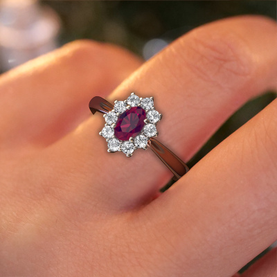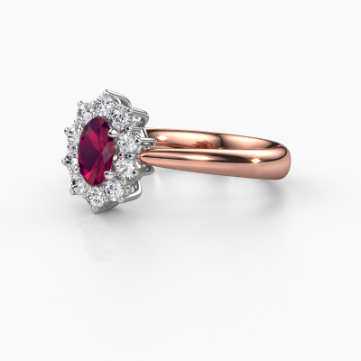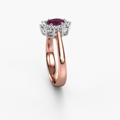 Bovenstaande verlovingsring heeft de naam Leesa 1. Dit type verlovingsring noemen we een Lady Diana ring. Hierbij worden rondom de middensteen in een open zetting allemaal kleine edelstenen gezet. Deze verlovingsring uitgevoerd in 14 Carat rosé goud heeft een ovale rhodoliet van 6x4 mm als center steen met daaromheen kleine diamanten. Wat deze klassieke rosé gouden Lady Diana verlovingsring bijzonder maakt, zijn de kleinere edelstenen die rondom de grote rhodoliet zijn gezet in de vorm van een prachtige bloem. Hierdoor lijkt het één grote fonkelende edelsteen te vormen. Een andere naam voor deze verlovingsring is hierdoor ook wel de flower of de rozet ring. Deze kleinere diamanten moeten dan echter wel allen op dezelfde manier geplaatst zijn, zodat het licht niet onderbroken wordt in de rhodoliet en er inderdaad een prachtige eenheid gecreëerd wordt. En daar zorgen onze meestergoudsmeden voor. Met uiterste precisie wordt iedere zorgvuldig geselecteerde rhodoliet met de hand in de verlovingsring geplaatst. Steeds opnieuw wordt de verlovingsring onder de loep gehouden om te zien of het speciale effect nog steeds zichtbaar is. Het resultaat is een unieke verlovingsring, waarbij de gekozen rhodoliet letterlijk het stralende middelpunt wordt. Je kunt je voorstellen dat deze verlovingsring werkelijk een betekenisvolle verlovingsring is om aan jouw liefde voor het leven te schenken! Op de dag dat jij laat zien dat zij jouw stralende middelpunt is! Dit juweel is gemaakt om aan jouw vinger te stralen, ieder sieraad wordt met liefde door onze goudsmeden met de hand gemaakt.Onze goudsmeden vervaardigen pas je Leesa 1 verlovingsring, zodra je deze besteld hebt. We hebben geen voorraden. Het voordeel hiervan is dat we de voorraad niet door hoeven te berekenen in de prijs, en kunnen daardoor sieraden leveren tegen een bijzonder lage prijs.Heb je zelf een specifieke verlovingsring ergens gezien, die je graag aan jouw geliefde zou willen geven? Bespreek gerust jouw ideeën met onze sieradenontwerpers, want wij zetten graag jouw ontwerp om tot een klassieke verlovingsring. Je kunt tijdens het ontwerpproces steeds meekijken, omdat wij met 3D tekeningen werken. Je krijgt hierdoor al een realistische indruk van hoe jouw ontwerp er in werkelijkheid uit komt te zien. Daarbij kun je een dummy vooraf bestellen. Een dummy is een kunststof ring, die precies dezelfde vormen heeft als jouw uiteindelijke ontwerp. Je kunt deze passen en zien of de breedte en dikte bijvoorbeeld naar wens zijn. Wij sturen je graag een vrijblijvende offerte, waarbij je ongetwijfeld versteld zult staan over de prijs en de kwaliteit van de ring en edelstenen.Om het voor jou makkelijker te maken kun je ieder besteld sieraad binnen 30 dagen na aflevering eenvoudig weer retour sturen.