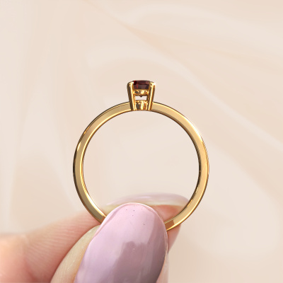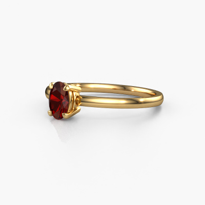 Bovenstaande verlovingsring heeft de naam Lynelle 1. Dit type verlovingsring noemen we een solitaire verlovingsring omdat hij een enkele edelsteen bevat. De verlovingsring is uitgevoerd in 14 Carat goud en heeft een ovale granaat ter grootte van 6x4 mm. Deze schitterende modieuze gouden solitaire ring heeft een prachtige ovale granaat om je aanzoek heel speciaal te maken. De open chatonzetting zorgt voor een prachtige lichtinval op de diamant. Wist je dat de diamant bijvoorbeeld symbool staat voor eeuwige liefde en trouw? Juist daarom is het een prachtige edelsteen om in het middelpunt te stellen. Onze goudsmid plaatst met veel zorgvuldigheid de gekozen edelsteen hoog op de ring, waardoor het een echte eyecatcher is. Ieder juweel is uniek, doordat je deze ring geheel naar eigen wensen kunt samenstellen.Door het gebruik van de modernste technieken, gecombineerd met ambachtelijk vakmanschap kunnen wij alle verlovingsringen zelf in ons atelier maken. Ieder sieraad wordt pas gemaakt nadat deze besteld is. Dit heeft als bijkomend voordeel dat we kunnen leveren tegen een prijs die je nergens anders tegenkomt.Ons team ontwerpt dagelijks nieuwe ringen in diverse stijlen. Heb je zelf een solitaire verlovingsring ergens gezien, die jij het liefst aan jouw geliefde zou willen geven? Je kunt altijd jouw ideeën en ontwerp met onze sieradenontwerpers bespreken, want wij zetten graag jouw ontwerp om tot een modieuze verlovingsring. Je kunt tijdens het ontwerpproces steeds meekijken, omdat het ontwerp in een zeer gedetailleerde 3D tekening wordt omgezet. Daarbij kun je een dummy bestellen van het uiteindelijke ontwerp. Een dummy is een kunststof ring, die precies dezelfde vormen heeft als jouw uiteindelijke ontwerp. Je kunt deze passen en zien of de ontworpen verlovingsring helemaal naar jouw wens is. Wij sturen je graag een vrijblijvende offerte, waarbij je ongetwijfeld versteld zult staan over de prijs en de kwaliteit van de ring en edelstenen.Om het voor jou makkelijker te maken kun je ieder besteld sieraad binnen 30 dagen na aflevering eenvoudig weer retour sturen.
