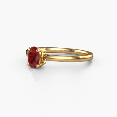Bovenstaande verlovingsring heeft de naam Lynelle 1. Dit type verlovingsring noemen we een solitaire verlovingsring omdat hij een enkele edelsteen bevat. De verlovingsring is uitgevoerd in 14 Carat goud en heeft een ovale robijn ter grootte van 6x4 mm. Deze schitterende modieuze gouden solitaire ring heeft een prachtige ovale robijn om je aanzoek heel speciaal te maken. De open chatonzetting zorgt voor een prachtige lichtinval op de diamant. Wist je dat de diamant bijvoorbeeld symbool staat voor eeuwige liefde en trouw? Juist daarom is het een prachtige edelsteen om in het middelpunt te stellen. Onze goudsmid plaatst met veel zorgvuldigheid de gekozen edelsteen hoog op de ring, waardoor het een echte eyecatcher is. Ieder juweel is uniek, doordat je deze ring geheel naar eigen wensen kunt samenstellen.Door het gebruik van de modernste technieken, gecombineerd met ambachtelijk vakmanschap kunnen wij alle verlovingsringen zelf in ons atelier maken. Ieder sieraad wordt pas gemaakt nadat deze besteld is. Dit heeft als bijkomend voordeel dat we kunnen leveren tegen een prijs die je nergens anders tegenkomt.Ons team ontwerpt dagelijks nieuwe ringen in diverse stijlen. Heb je zelf een solitaire verlovingsring ergens gezien, die jij het liefst aan jouw geliefde zou willen geven? Je kunt altijd jouw ideeën en ontwerp met onze sieradenontwerpers bespreken, want wij zetten graag jouw ontwerp om tot een modieuze verlovingsring. Je kunt tijdens het ontwerpproces steeds meekijken, omdat het ontwerp in een zeer gedetailleerde 3D tekening wordt omgezet. Daarbij kun je een dummy bestellen van het uiteindelijke ontwerp. Een dummy is een kunststof ring, die precies dezelfde vormen heeft als jouw uiteindelijke ontwerp. Je kunt deze passen en zien of de ontworpen verlovingsring helemaal naar jouw wens is. Wij sturen je graag een vrijblijvende offerte, waarbij je ongetwijfeld versteld zult staan over de prijs en de kwaliteit van de ring en edelstenen.Om het voor jou makkelijker te maken kun je ieder besteld sieraad binnen 30 dagen na aflevering eenvoudig weer retour sturen.