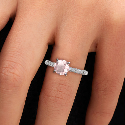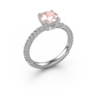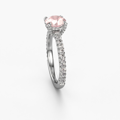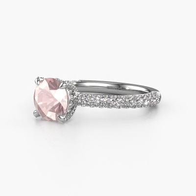 Bovenstaande verlovingsring heeft de naam Saskia rnd 2. Dit type verlovingsring noemen we een pavé solitaire verlovingsring omdat hij een enkele middensteen heeft waarbij de banden van de verlovingsring ook volgezet zijn. De verlovingsring is uitgevoerd in de combinatie platina met platina en heeft als middensteen een ronde morganiet champagne ter grootte van 7 mm en in de zijbanden zijn lab-grown diamanten gezet. Ieder juweel is gemaakt door een team van gedreven goudsmeden en designers. Hierdoor zal dit unieke pronkstuk een echte eyecatcher zijn.Deze exclusieve platina pavé solitaire verlovingsring heeft een schitterende ronde morganiet champagne als centersteen, waarbij in de band nog meer morganiet champagne zijn gezet om de middensteen nog meer te accentueren. Doordat de zetting van de pootjes om de morganiet champagne open is, vangt de morganiet champagne het licht van alle kanten op en schittert hierdoor optimaal. Hierboven kun je zien hoe onze goudsmid de verlovingsring heel precies tot in de kleinste details heeft bewerkt, zodat de wat hoger gelegen morganiet champagne een echte eyecatcher is. Wat een prachtige verlovingsring om te geven bij je aanzoek aan de liefde van jouw leven, aan jouw stralende middelpunt!Wist je dat we een beste prijs garantie geven voor jouw verlovingsring? Dit is mogelijk omdat al onze sieraden met de hand gemaakt worden in ons eigen atelier. We hebben geen dure voorraden, en we maken pas je verlovingsring op het moment dat je besteld hebt. Doordat we de hele productie zelf in de hand hebben, kunnen wij je goed informeren over alle eigenschappen van deze ring. Juist omdat het kopen van een verlovingsring online spannend is, begrijpen wij dat het fijn is om alle kenmerken te weten van jouw ring.Ons team is iedere dag weer bezig om nieuwe ontwerpen toe te voegen, in samenwerking met onze designers en goudsmeden wordt gekeken hoe we tot het mooiste ontwerp kunnen komen. Wij doen ons best om tot een zo gevarieerd mogelijk aanbod te komen. Wellicht heb je zelf al een mooi idee van een sieraad dat je ooit wel eens gezien hebt. Neem dan eens vrijblijvend contact met ons op. Wij maken een offerte voor je op waarbij wij vrij zeker zijn dat we wat betreft kwaliteit en prijs jou versteld zullen laten staan.Om het voor jou makkelijker te maken kun je ieder besteld sieraad binnen 30 dagen na aflevering eenvoudig weer retour sturen.