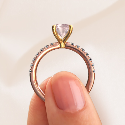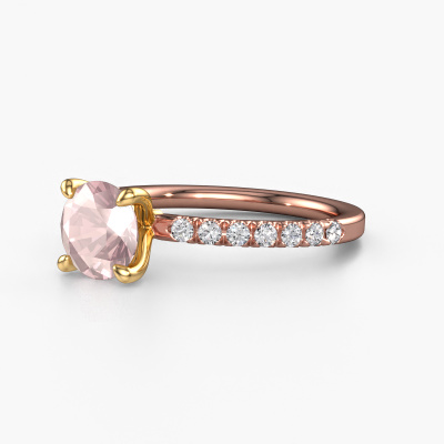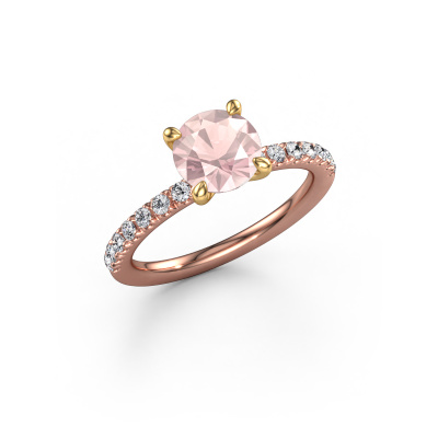 Bovenstaande verlovingsring heeft de naam Crystal RND 2. Dit type verlovingsring noemen we een pavé solitaire verlovingsring omdat hij een enkele middensteen heeft waarbij de banden van de verlovingsring ook volgezet zijn. De verlovingsring is uitgevoerd in de combinatie 14 Carat rosé goud met goud en heeft als middensteen een ronde morganiet champagne ter grootte van 7 mm en in de zijbanden zijn lab-grown diamanten gezet. Ieder juweel is uniek, doordat je deze ring geheel naar eigen wensen kunt samenstellen.Deze klassieke rosé gouden pavé solitaire verlovingsring heeft een schitterende ronde morganiet champagne als centersteen, waarbij in de band nog meer morganiet champagne zijn gezet om de middensteen nog meer te accentueren. Doordat de zetting van de pootjes om de morganiet champagne open is, vangt de morganiet champagne het licht van alle kanten op en schittert hierdoor optimaal. Hierboven kun je zien hoe onze goudsmid de verlovingsring heel precies tot in de kleinste details heeft bewerkt, zodat de wat hoger gelegen morganiet champagne een echte eyecatcher is. Wat een prachtige verlovingsring om te geven bij je aanzoek aan de liefde van jouw leven, aan jouw stralende middelpunt!Onze goudsmeden vervaardigen pas je Crystal RND 2 verlovingsring, zodra je deze besteld hebt. We hebben geen voorraden. Het voordeel hiervan is dat we de voorraad niet door hoeven te berekenen in de prijs, en kunnen daardoor sieraden leveren tegen een bijzonder lage prijs.Ons team ontwerpt dagelijks nieuwe ringen in diverse stijlen. Heb je zelf een pavé solitaire verlovingsring ergens gezien, die jij het liefst aan jouw geliefde zou willen geven? Je kunt altijd jouw ideeën en ontwerp met onze sieradenontwerpers bespreken, want wij zetten graag jouw ontwerp om tot een klassieke verlovingsring. Je kunt tijdens het ontwerpproces steeds meekijken, omdat het ontwerp in een zeer gedetailleerde 3D tekening wordt omgezet. Daarbij kun je een dummy bestellen van het uiteindelijke ontwerp. Een dummy is een kunststof ring, die precies dezelfde vormen heeft als jouw uiteindelijke ontwerp. Je kunt deze passen en zien of de ontworpen verlovingsring helemaal naar jouw wens is. Wij sturen je graag een vrijblijvende offerte, waarbij je ongetwijfeld versteld zult staan over de prijs en de kwaliteit van de ring en edelstenen.Om het voor jou makkelijker te maken kun je ieder besteld sieraad binnen 30 dagen na aflevering eenvoudig weer retour sturen.