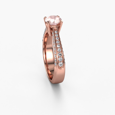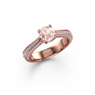 Bovenstaande verlovingsring heeft de naam Ruby rnd. Dit type verlovingsring noemen we een pavé solitaire verlovingsring omdat hij een enkele middensteen heeft waarbij de banden van de verlovingsring ook volgezet zijn. Deze verlovingsring is uitgevoerd in 14 Carat rosé goud en heeft als middensteen een ronde morganiet champagne ter grootte van 5.7 mm, en in de zijbanden zijn diamanten gezet. Ieder juweel is speciaal voor jou gemaakt, met aandacht voor detail en design.. Deze exclusieve rosé gouden pavé solitaire verlovingsring heeft een schitterende ronde morganiet champagne als center steen, waarbij in de band nog meer diamanten zijn gezet om de middensteen nog meer te accentueren. Doordat de zetting van de pootjes om de morganiet champagne open is, vangt de morganiet champagne het licht van alle kanten op en schittert hierdoor optimaal. Hierboven kun je zien hoe onze goudsmid de verlovingsring heel precies tot in de kleinste details heeft bewerkt, zodat de wat hoger gelegen morganiet champagne een echte eyecatcher is. Wat een prachtige verlovingsring om te geven bij je aanzoek aan de liefde van jouw leven, aan jouw stralende middelpunt!Omdat wij zelf alle verlovingsring maken en direct aan jou leveren kunnen wij je een verlovingsring leveren tegen een prijs die je nergens anders zult tegenkomen. Een ring wordt pas gemaakt als we een bestelling krijgen, hierdoor hebben wij geen dure voorraden en kunnen wij je de beste prijs garanderen. Wij begrijpen dat het kopen van een verlovingsring online spannend is en willen daarom je zoveel mogelijk informeren over alle specifieke eigenschappen van de ring die jij koopt.Heb je zelf een speciale ring in gedachten, die je wellicht ergens gezien hebt? Je kunt je ideeën altijd met ons bespreken, wij zetten graag jouw ontwerp om tot een unieke verlovingsring. Het ontwerp kun je volgen, omdat wij met 3D tekeningen werken. Hierdoor krijg je al een realistische indruk van hoe jouw ontwerp er in het echt uit komt te zien. Wij sturen je graag een vrijblijvende offerte, waarbij je ongetwijfeld verwonderd zult zijn over de prijs in combinatie met de uitstekende kwaliteit die we aanbieden.Om het voor jou makkelijker te maken kun je ieder besteld sieraad binnen 30 dagen na aflevering eenvoudig weer retour sturen.