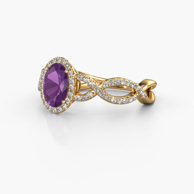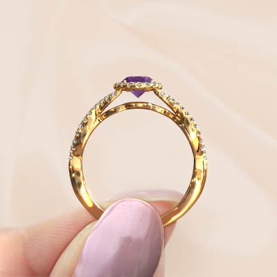 Deze verlovingsring heeft de naam Dionne ovl. Deze getordeerde verlovingsring uitgevoerd, in 14 Carat goud is gezet met 7x5 mm amethist. Deze exclusieve gouden pavé solitaire verlovingsring is een puur staaltje vakmanschap! Alle kleine details zijn door onze goudsmid met veel geduld en passie vervaardigd. Dit ambacht vraagt een deskundig oog en vaardige hand om deze verlovingsring met uiterste precisie samen te stellen. En dat is precies waar onze goudsmeden enthousiast van worden! De prachtige amethisten zijn op een bijzondere manier gezet, zodat deze nog beter tot zijn recht komen. Dit geeft de verlovingsring extra allure. De verlovingsring is al uniek door zijn natuurlijke edelsteen, die we speciaal geselecteerd hebben voor deze ring. Daarnaast kun je zelf de samenstelling kiezen van het edelmetaal, waardoor je uiteindelijk een unieke verlovingsring hebt gecreëerd voor de meest exclusieve vrouw in je leven! Dit juweel is uniek, doordat je deze ring geheel naar eigen wensen kunt samenstellen.Onze goudsmeden vervaardigen pas je Dionne ovl verlovingsring, zodra je deze besteld hebt. We hebben geen voorraden. Het voordeel hiervan is dat we de voorraad niet door hoeven te berekenen in de prijs, en kunnen daardoor sieraden leveren tegen een bijzonder lage prijs.Ons team ontwerpt dagelijks nieuwe ringen in diverse stijlen. Heb je zelf een pavé solitaire verlovingsring ergens gezien, die jij het liefst aan jouw geliefde zou willen geven? Je kunt altijd jouw ideeën en ontwerp met onze sieradenontwerpers bespreken, want wij zetten graag jouw ontwerp om tot een exclusieve verlovingsring. Je kunt tijdens het ontwerpproces steeds meekijken, omdat het ontwerp in een zeer gedetailleerde 3D tekening wordt omgezet. Daarbij kun je een dummy bestellen van het uiteindelijke ontwerp. Een dummy is een kunststof ring, die precies dezelfde vormen heeft als jouw uiteindelijke ontwerp. Je kunt deze passen en zien of de ontworpen verlovingsring helemaal naar jouw wens is. Wij sturen je graag een vrijblijvende offerte, waarbij je ongetwijfeld versteld zult staan over de prijs en de kwaliteit van de ring en edelstenen.Om het voor jou makkelijker te maken kun je ieder besteld sieraad binnen 30 dagen na aflevering eenvoudig weer retour sturen.