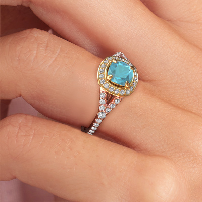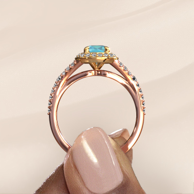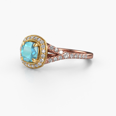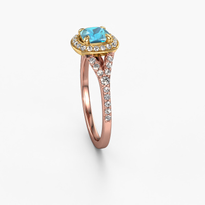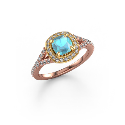 Bovenstaande verlovingsring heeft de naam Pamela CUS. Dit type verlovingsring noemen we een halo ring. De verlovingsring is uitgevoerd in 14 Carat rosé goud en heeft als middensteen een cushion blauw topaas ter grootte van 5.5 mm en eromheen zijn kleine lab-grown diamanten gezet. Het bijzondere van deze luxe rosé gouden pavé solitaire verlovingsring zijn de kleinere edelstenen die rondom de grote blauw topaas zijn gezet. Dat is ook waar deze mooie verlovingsring zijn naam door heeft gekregen: pavé solitaire betekent lichtkrans en dat is ook waar de kleinere edelstenen voor zorgen. Deze kleinere edelstenen moeten dan echter wel allen op dezelfde manier geplaatst zijn, zodat het licht niet doorbroken wordt in de blauw topaas en er inderdaad een prachtige lichtkrans gecreëerd wordt. En daar zorgen onze meestergoudsmeden voor. Met uiterste precisie wordt iedere zorgvuldig geselecteerde blauw topaas met de hand in de verlovingsring geplaatst. Steeds opnieuw wordt de verlovingsring tegen het licht gehouden om te zien of het speciale effect nog steeds zichtbaar is. Het resultaat is een unieke verlovingsring, waarbij de gekozen blauw topaas letterlijk het stralende middelpunt wordt. Je kunt je voorstellen dat deze verlovingsring werkelijk een betekenisvolle verlovingsring is om aan jouw liefde voor het leven te schenken! Op de dag dat jij laat zien dat zij jouw stralende middelpunt is!Wist je dat we een beste prijs garantie geven voor jouw verlovingsring? Dit is mogelijk omdat al onze sieraden met de hand gemaakt worden in ons eigen atelier. We hebben geen dure voorraden, en we maken pas je verlovingsring op het moment dat je besteld hebt. Doordat we de hele productie zelf in de hand hebben, kunnen wij je goed informeren over alle eigenschappen van deze ring. Juist omdat het kopen van een verlovingsring online spannend is, begrijpen wij dat het fijn is om alle kenmerken te weten van jouw ring.Ons team ontwerpt dagelijks nieuwe ringen in diverse stijlen. Heb je zelf een pavé solitaire verlovingsring ergens gezien, die jij het liefst aan jouw geliefde zou willen geven? Je kunt altijd jouw ideeën en ontwerp met onze sieradenontwerpers bespreken, want wij zetten graag jouw ontwerp om tot een luxe verlovingsring. Je kunt tijdens het ontwerpproces steeds meekijken, omdat het ontwerp in een zeer gedetailleerde 3D tekening wordt omgezet. Daarbij kun je een dummy bestellen van het uiteindelijke ontwerp. Een dummy is een kunststof ring, die precies dezelfde vormen heeft als jouw uiteindelijke ontwerp. Je kunt deze passen en zien of de ontworpen verlovingsring helemaal naar jouw wens is. Wij sturen je graag een vrijblijvende offerte, waarbij je ongetwijfeld versteld zult staan over de prijs en de kwaliteit van de ring en edelstenen.Om het voor jou makkelijker te maken kun je ieder besteld sieraad binnen 30 dagen na aflevering eenvoudig weer retour sturen.