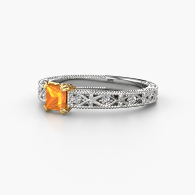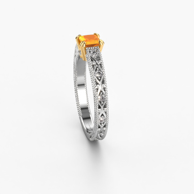 Deze verlovingsring heeft de naam Ardella. Deze ring, uitgevoerd in 14 Carat witgoud is gezet met 4 mm citrien. Een bijzondere witgouden vintage ring, deze unieke verlovingsring die jouw liefde van je leven zeker laat stralen! En dat is precies waar wij voor gaan. In deze vintage verlovingsring is prachtige citrien verwerkt. Je kunt natuurlijk iedere edelsteen die wij aanbieden hierin laten verwerken. De edelsteen is zorgvuldig geselecteerd, want wij vinden dat op jouw filigraan verlovingsring alleen de mooiste edelsteen mag schitteren, toch? Onze goudsmid vervaardigt jouw verlovingsring in ons eigen atelier, en plaatst de citrien met uiterste precisie in de ring. Vervolgens wordt deze bijgewerkt en gepolijst totdat het resultaat zichtbaar is: de perfecte verlovingsring voor de liefde van jouw leven! Dit juweel wordt speciaal voor jou gemaakt door onze meester goudsmeden in ons eigen atelier.Wist je dat we een beste prijs garantie geven voor jouw verlovingsring? Dit is mogelijk omdat al onze sieraden met de hand gemaakt worden in ons eigen atelier. We hebben geen dure voorraden, en we maken pas je verlovingsring op het moment dat je besteld hebt. Doordat we de hele productie zelf in de hand hebben, kunnen wij je goed informeren over alle eigenschappen van deze ring. Juist omdat het kopen van een verlovingsring online spannend is, begrijpen wij dat het fijn is om alle kenmerken te weten van jouw ring.Ons team ontwerpt dagelijks nieuwe ringen in diverse stijlen. Heb je zelf een pavé solitaire verlovingsring ergens gezien, die jij het liefst aan jouw geliefde zou willen geven? Je kunt altijd jouw ideeën en ontwerp met onze sieradenontwerpers bespreken, want wij zetten graag jouw ontwerp om tot een vintage verlovingsring. Je kunt tijdens het ontwerpproces steeds meekijken, omdat het ontwerp in een zeer gedetailleerde 3D tekening wordt omgezet. Daarbij kun je een dummy bestellen van het uiteindelijke ontwerp. Een dummy is een kunststof ring, die precies dezelfde vormen heeft als jouw uiteindelijke ontwerp. Je kunt deze passen en zien of de ontworpen verlovingsring helemaal naar jouw wens is. Wij sturen je graag een vrijblijvende offerte, waarbij je ongetwijfeld versteld zult staan over de prijs en de kwaliteit van de ring en edelstenen.Om het voor jou makkelijker te maken kun je ieder besteld sieraad binnen 30 dagen na aflevering eenvoudig weer retour sturen.