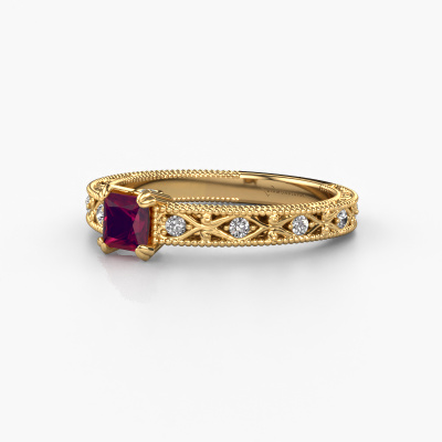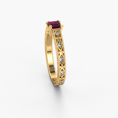 Deze verlovingsring heeft de naam Ardella. Deze ring, uitgevoerd in 14 Carat goud is gezet met 4 mm rhodoliet. Een bijzondere gouden vintage ring, deze unieke verlovingsring die jouw liefde van je leven zeker laat stralen! En dat is precies waar wij voor gaan. In deze vintage verlovingsring is prachtige rhodoliet verwerkt. Je kunt natuurlijk iedere edelsteen die wij aanbieden hierin laten verwerken. De edelsteen is zorgvuldig geselecteerd, want wij vinden dat op jouw filigraan verlovingsring alleen de mooiste edelsteen mag schitteren, toch? Onze goudsmid vervaardigt jouw verlovingsring in ons eigen atelier, en plaatst de rhodoliet met uiterste precisie in de ring. Vervolgens wordt deze bijgewerkt en gepolijst totdat het resultaat zichtbaar is: de perfecte verlovingsring voor de liefde van jouw leven! Dit juweel wordt speciaal voor jou gemaakt door onze meester goudsmeden in ons eigen atelier.Wist je dat we een beste prijs garantie geven voor jouw verlovingsring? Dit is mogelijk omdat al onze sieraden met de hand gemaakt worden in ons eigen atelier. We hebben geen dure voorraden, en we maken pas je verlovingsring op het moment dat je besteld hebt. Doordat we de hele productie zelf in de hand hebben, kunnen wij je goed informeren over alle eigenschappen van deze ring. Juist omdat het kopen van een verlovingsring online spannend is, begrijpen wij dat het fijn is om alle kenmerken te weten van jouw ring.Ons team ontwerpt dagelijks nieuwe ringen in diverse stijlen. Heb je zelf een pavé solitaire verlovingsring ergens gezien, die jij het liefst aan jouw geliefde zou willen geven? Je kunt altijd jouw ideeën en ontwerp met onze sieradenontwerpers bespreken, want wij zetten graag jouw ontwerp om tot een vintage verlovingsring. Je kunt tijdens het ontwerpproces steeds meekijken, omdat het ontwerp in een zeer gedetailleerde 3D tekening wordt omgezet. Daarbij kun je een dummy bestellen van het uiteindelijke ontwerp. Een dummy is een kunststof ring, die precies dezelfde vormen heeft als jouw uiteindelijke ontwerp. Je kunt deze passen en zien of de ontworpen verlovingsring helemaal naar jouw wens is. Wij sturen je graag een vrijblijvende offerte, waarbij je ongetwijfeld versteld zult staan over de prijs en de kwaliteit van de ring en edelstenen.Om het voor jou makkelijker te maken kun je ieder besteld sieraad binnen 30 dagen na aflevering eenvoudig weer retour sturen.