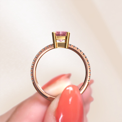 Deze verlovingsring heeft de naam Denita 2 RAD. Deze micropavé verlovingsring uitgevoerd, in 14 Carat rosé goud is gezet met 7.5x5.5 mm roze lab grown diamant. Deze exclusieve rosé gouden pavé solitaire verlovingsring is een puur staaltje vakmanschap! Alle kleine details zijn door onze goudsmid met veel geduld en passie vervaardigd. Dit ambacht vraagt een deskundig oog en vaardige hand om deze verlovingsring met uiterste precisie samen te stellen. En dat is precies waar onze goudsmeden enthousiast van worden! De prachtige roze lab grown diamanten zijn op een bijzondere manier gezet, zodat deze nog beter tot zijn recht komen. Dit geeft de verlovingsring extra allure. De verlovingsring is al uniek door zijn natuurlijke edelsteen, die we speciaal geselecteerd hebben voor deze ring. Daarnaast kun je zelf de samenstelling kiezen van het edelmetaal, waardoor je uiteindelijk een unieke verlovingsring hebt gecreëerd voor de meest exclusieve vrouw in je leven! Dit juweel wordt met passie en liefde gemaakt door één van onze meestergoudsmeden.Wist je dat we een beste prijs garantie geven voor jouw verlovingsring? Dit is mogelijk omdat al onze sieraden met de hand gemaakt worden in ons eigen atelier. We hebben geen dure voorraden, en we maken pas je verlovingsring op het moment dat je besteld hebt. Doordat we de hele productie zelf in de hand hebben, kunnen wij je goed informeren over alle eigenschappen van deze ring. Juist omdat het kopen van een verlovingsring online spannend is, begrijpen wij dat het fijn is om alle kenmerken te weten van jouw ring.Heb je zelf een speciale ring in gedachten, die je wellicht ergens gezien hebt? Je kunt je ideeën altijd met ons bespreken, wij zetten graag jouw ontwerp om tot een unieke verlovingsring. Het ontwerp kun je volgen, omdat wij met 3D tekeningen werken. Hierdoor krijg je al een realistische indruk van hoe jouw ontwerp er in het echt uit komt te zien. Wij sturen je graag een vrijblijvende offerte, waarbij je ongetwijfeld verwonderd zult zijn over de prijs in combinatie met de uitstekende kwaliteit die we aanbieden.Om het voor jou makkelijker te maken kun je ieder besteld sieraad binnen 30 dagen na aflevering eenvoudig weer retour sturen.