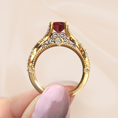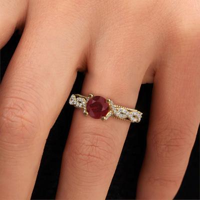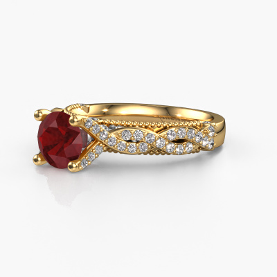 Deze verlovingsring heeft de naam Chantelle. Deze gedurfde verlovingsring uitgevoerd in 14 Carat goud is gezet met 6.5 mm robijn. Heeft jouw vriendin een zwak voor vintage? Dan kun je er vrijwel zeker van zijn dat deze gouden verlovingsring helemaal bij haar stijl zal passen! Een nieuw model, gebaseerd op vintage motieven. Ietwat dromerig, een prachtig ontwerp! Zeker als je deze nog verder aangepast naar jullie smaak. In deze vintage pavé solitaire verlovingsring zijn prachtige robijn verwerkt. Zoals je ziet kun je zelf voor een edelsteen kiezen die jij bij je vriendin vindt passen. Iedere edelsteen wordt zorgvuldig geselecteerd bij onze handelaren wereldwijd, onze goudsmid wil alleen de mooiste edelstenen op een juweel verwerken. Het is immers de kroon op zijn werk! Ieder juweel is gemaakt door een team van gedreven goudsmeden en designers. Hierdoor zal dit unieke pronkstuk een echte eyecatcher zijn.Wellicht is het je opgevallen dat onze prijzen gemiddeld 30% lager liggen dan bij een andere juwelier. En dat terwijl de kwaliteit in de meeste gevallen nog beter is! Dit komt doordat onze goudsmeden je verlovingsring direct in ons eigen atelier vervaardigen. Hierdoor hoeven we geen dure voorraden te hanteren en kunnen we ieder gewenst detail direct op jouw verlovingsring aanbrengen.Iedere dag is ons team van goudsmeden en sieradenontwerpers aan het werk om nieuwe sieraden te creëren. Het kan zijn dat je ergens een vintage verlovingsring gezien hebt, die je als basis wilt nemen bij het ontwerpen van jouw unieke ring. Neem gerust contact met ons op en we zullen je een aanbod doen, waar je vrijwel zeker verwonderd zult zijn over de kwaliteit en de prijs.Om het voor jou makkelijker te maken kun je ieder besteld sieraad binnen 30 dagen na aflevering eenvoudig weer retour sturen.