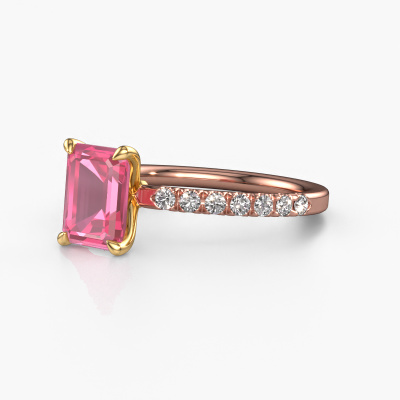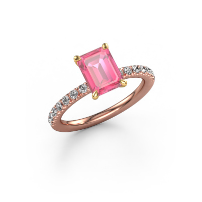 Bovenstaande verlovingsring heeft de naam Crystal EME 2, dit type verlovingsring noemen we een solitaire ring omdat hij een enkele edelsteen bevat. De verlovingsring is uitgevoerd in 14 Carat rosé goud en heeft een smaragd geslepen roze saffier ter grootte van 8x6 mm. Deze exclusieve rosé gouden solitaire ring met een schitterende smaragd geslepen roze saffier is een prachtige verlovingsring. Doordat de chatonzetting open is, is de lichtinval op de edelsteen optimaal. Ook plaatsen we de edelsteen hoog op de ring, waardoor deze extra opvalt. De diamant is bijvoorbeeld een prachtige edelsteen om aan de liefde van je leven te schenken, omdat deze symbool staat voor eeuwige liefde en zuiverheid. En dit symbool straalt midden op deze solitaire ring. Zo heeft iedere edelsteen een mooie symbolische betekenis. Deze solitaire verlovingsring kunt u zelf samenstellen in verschillende edelmetaal combinaties. Deze heeft de combinatie 14 Carat rosé goud met goud. Ieder juweel wordt speciaal voor jou gemaakt door onze meester goudsmeden in ons eigen atelier.Door het gebruik van de modernste technieken, gecombineerd met ambachtelijk vakmanschap kunnen wij alle verlovingsringen zelf in ons atelier maken. Ieder sieraad wordt pas gemaakt nadat deze besteld is. Dit heeft als bijkomend voordeel dat we kunnen leveren tegen een prijs die je nergens anders tegenkomt.Ons team is iedere dag weer bezig om nieuwe ontwerpen toe te voegen, in samenwerking met onze designers en goudsmeden wordt gekeken hoe we tot het mooiste ontwerp kunnen komen. Wij doen ons best om tot een zo gevarieerd mogelijk aanbod te komen. Wellicht heb je zelf al een mooi idee van een sieraad dat je ooit wel eens gezien hebt. Neem dan eens vrijblijvend contact met ons op. Wij maken een offerte voor je op waarbij wij vrij zeker zijn dat we wat betreft kwaliteit en prijs jou versteld zullen laten staan.Om het voor jou makkelijker te maken kun je ieder besteld sieraad binnen 30 dagen na aflevering eenvoudig weer retour sturen.