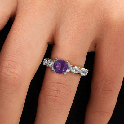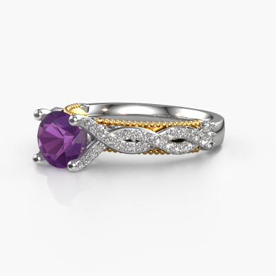 Deze verlovingsring heeft de naam Chantelle. Deze gedurfde verlovingsring uitgevoerd in 14 Carat witgoud is gezet met 6.5 mm amethist. Heeft jouw vriendin een zwak voor vintage? Dan kun je er vrijwel zeker van zijn dat deze witgouden verlovingsring helemaal bij haar stijl zal passen! Een nieuw model, gebaseerd op vintage motieven. Ietwat dromerig, een prachtig ontwerp! Zeker als je deze nog verder aangepast naar jullie smaak. In deze vintage pavé solitaire verlovingsring zijn prachtige amethisten verwerkt. Zoals je ziet kun je zelf voor een edelsteen kiezen die jij bij je vriendin vindt passen. Iedere edelsteen wordt zorgvuldig geselecteerd bij onze handelaren wereldwijd, onze goudsmid wil alleen de mooiste edelstenen op een juweel verwerken. Het is immers de kroon op zijn werk! Ieder juweel is gemaakt door een team van gedreven goudsmeden en designers. Hierdoor zal dit unieke pronkstuk een echte eyecatcher zijn.Wellicht is het je opgevallen dat onze prijzen gemiddeld 30% lager liggen dan bij een andere juwelier. En dat terwijl de kwaliteit in de meeste gevallen nog beter is! Dit komt doordat onze goudsmeden je verlovingsring direct in ons eigen atelier vervaardigen. Hierdoor hoeven we geen dure voorraden te hanteren en kunnen we ieder gewenst detail direct op jouw verlovingsring aanbrengen.Iedere dag is ons team van goudsmeden en sieradenontwerpers aan het werk om nieuwe sieraden te creëren. Het kan zijn dat je ergens een vintage verlovingsring gezien hebt, die je als basis wilt nemen bij het ontwerpen van jouw unieke ring. Neem gerust contact met ons op en we zullen je een aanbod doen, waar je vrijwel zeker verwonderd zult zijn over de kwaliteit en de prijs.Om het voor jou makkelijker te maken kun je ieder besteld sieraad binnen 30 dagen na aflevering eenvoudig weer retour sturen.