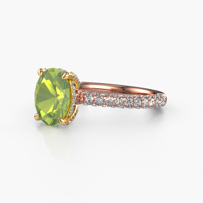 Bovenstaande verlovingsring heeft de naam Saskia 2 ovl. Dit type verlovingsring noemen we een pavé solitaire verlovingsring omdat hij een enkele middensteen heeft waarbij de banden van de verlovingsring ook volgezet zijn. De verlovingsring is uitgevoerd in de combinatie 14 Carat rosé goud met goud en heeft als middensteen een ovale peridoot ter grootte van 9x7 mm en in de zijbanden zijn lab-grown diamanten gezet. Ieder juweel wordt speciaal voor jou gemaakt door onze meester goudsmeden in ons eigen atelier.Deze exclusieve rosé gouden pavé solitaire verlovingsring heeft een schitterende ovale peridoot als centersteen, waarbij in de band nog meer peridoot zijn gezet om de middensteen nog meer te accentueren. Doordat de zetting van de pootjes om de peridoot open is, vangt de peridoot het licht van alle kanten op en schittert hierdoor optimaal. Hierboven kun je zien hoe onze goudsmid de verlovingsring heel precies tot in de kleinste details heeft bewerkt, zodat de wat hoger gelegen peridoot een echte eyecatcher is. Wat een prachtige verlovingsring om te geven bij je aanzoek aan de liefde van jouw leven, aan jouw stralende middelpunt!Wist je dat we een beste prijs garantie geven voor jouw verlovingsring? Dit is mogelijk omdat al onze sieraden met de hand gemaakt worden in ons eigen atelier. We hebben geen dure voorraden, en we maken pas je verlovingsring op het moment dat je besteld hebt. Doordat we de hele productie zelf in de hand hebben, kunnen wij je goed informeren over alle eigenschappen van deze ring. Juist omdat het kopen van een verlovingsring online spannend is, begrijpen wij dat het fijn is om alle kenmerken te weten van jouw ring.Heb je zelf een specifieke verlovingsring ergens gezien, die je graag aan jouw geliefde zou willen geven? Bespreek gerust jouw ideeën met onze sieradenontwerpers, want wij zetten graag jouw ontwerp om tot een exclusieve verlovingsring. Je kunt tijdens het ontwerpproces steeds meekijken, omdat wij met 3D tekeningen werken. Je krijgt hierdoor al een realistische indruk van hoe jouw ontwerp er in werkelijkheid uit komt te zien. Daarbij kun je een dummy vooraf bestellen. Een dummy is een kunststof ring, die precies dezelfde vormen heeft als jouw uiteindelijke ontwerp. Je kunt deze passen en zien of de breedte en dikte bijvoorbeeld naar wens zijn. Wij sturen je graag een vrijblijvende offerte, waarbij je ongetwijfeld versteld zult staan over de prijs en de kwaliteit van de ring en edelstenen.Om het voor jou makkelijker te maken kun je ieder besteld sieraad binnen 30 dagen na aflevering eenvoudig weer retour sturen.