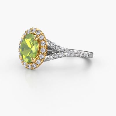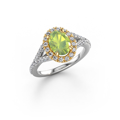 Bovenstaande verlovingsring heeft de naam Kimber OVL. Dit type verlovingsring noemen we een pavé solitaire verlovingsring omdat hij een enkele middensteen heeft waarbij de banden van de verlovingsring ook volgezet zijn. De verlovingsring is uitgevoerd in de combinatie 14 Carat witgoud met goud en heeft als middensteen een ovale peridoot ter grootte van 8x6 mm en in de zijbanden zijn lab-grown diamanten gezet. Ieder juweel wordt met passie en liefde gemaakt door één van onze meestergoudsmeden.Deze exclusieve witgouden pavé solitaire verlovingsring heeft een schitterende ovale peridoot als centersteen, waarbij in de band nog meer peridoot zijn gezet om de middensteen nog meer te accentueren. Doordat de zetting van de pootjes om de peridoot open is, vangt de peridoot het licht van alle kanten op en schittert hierdoor optimaal. Hierboven kun je zien hoe onze goudsmid de verlovingsring heel precies tot in de kleinste details heeft bewerkt, zodat de wat hoger gelegen peridoot een echte eyecatcher is. Wat een prachtige verlovingsring om te geven bij je aanzoek aan de liefde van jouw leven, aan jouw stralende middelpunt!Door het gebruik van de modernste technieken, gecombineerd met ambachtelijk vakmanschap kunnen wij alle verlovingsringen zelf in ons atelier maken. Ieder sieraad wordt pas gemaakt nadat deze besteld is. Dit heeft als bijkomend voordeel dat we kunnen leveren tegen een prijs die je nergens anders tegenkomt.Ons team is iedere dag weer bezig om nieuwe ontwerpen toe te voegen, in samenwerking met onze designers en goudsmeden wordt gekeken hoe we tot het mooiste ontwerp kunnen komen. Wij doen ons best om tot een zo gevarieerd mogelijk aanbod te komen. Wellicht heb je zelf al een mooi idee van een sieraad dat je ooit wel eens gezien hebt. Neem dan eens vrijblijvend contact met ons op. Wij maken een offerte voor je op waarbij wij vrij zeker zijn dat we wat betreft kwaliteit en prijs jou versteld zullen laten staan.Om het voor jou makkelijker te maken kun je ieder besteld sieraad binnen 30 dagen na aflevering eenvoudig weer retour sturen.