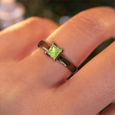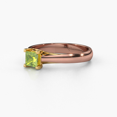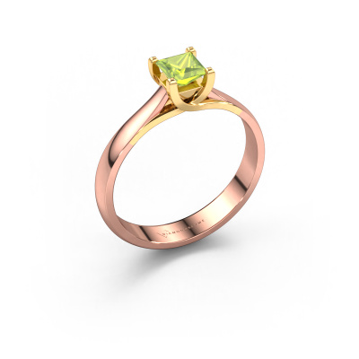 Bovenstaande aanzoeksring heeft de naam Mia Square, dit type aanzoeksring noemen we een solitaire ring omdat hij een enkele edelsteen bevat. De aanzoeksring is uitgevoerd in 14 Carat rosé goud en heeft een princess peridoot ter grootte van 4 mm. Het leuke van onze configurator is dat je zelf je juweel kunt samenstellen tot een eigen persoonlijk juweel. Deze solitaire ring is uitgevoerd in de edelmetaal combinatie rosé goud met goud, maar u kunt dus ook uit andere kleuren kiezen. Ieder juweel is gemaakt door een team van gedreven goudsmeden en designers. Hierdoor zal dit unieke pronkstuk een echte eyecatcher zijn.De solitaire aanzoeksring is een bijzondere aanzoeksring. Juist doordat de chatonzetting open is, creëert de lichtinval een schitterend effect op de edelsteen. Omdat de gekozen edelsteen hoog op de aanzoeksring geplaatst wordt, wordt deze moderne aanzoeksring een prachtige eyecatcher. Met veel zorgvuldigheid vervaardigen wij alle details in deze solitaire aanzoeksring met de hand, zodat jij binnenkort je aanzoek kunt bekronen met een unieke ring, speciaal voor de liefde van jouw leven!Door onze modernste technieken kunnen wij met uiterste precisie prachtige sieraden te ontwerpen en voor jou personaliseren in de hoogste juwelierskwaliteit. Tegelijkertijd zijn onze aanzoeksringen altijd 30% goedkoper dan bij een andere juwelier. Dit komt doordat alle aanzoeksringen pas vervaardigd worden op het moment dat deze besteld wordt en we daardoor geen dure voorraden hoeven te hanteren. Mocht je aan een bepaald budget gebonden zijn, kunnen we je graag adviseren welke combinatie je het beste kunt kiezen.Heb je zelf een specifieke aanzoeksring ergens gezien, die je graag aan jouw geliefde zou willen geven? Bespreek gerust jouw ideeën met onze sieradenontwerpers, want wij zetten graag jouw ontwerp om tot een moderne aanzoeksring. Je kunt tijdens het ontwerpproces steeds meekijken, omdat wij met 3D tekeningen werken. Je krijgt hierdoor al een realistische indruk van hoe jouw ontwerp er in werkelijkheid uit komt te zien. Daarbij kun je een dummy vooraf bestellen. Een dummy is een kunststof ring, die precies dezelfde vormen heeft als jouw uiteindelijke ontwerp. Je kunt deze passen en zien of de breedte en dikte bijvoorbeeld naar wens zijn. Wij sturen je graag een vrijblijvende offerte, waarbij je ongetwijfeld versteld zult staan over de prijs en de kwaliteit van de ring en edelstenen.Om het voor jou makkelijker te maken kun je ieder besteld sieraad binnen 30 dagen na aflevering eenvoudig weer retour sturen.